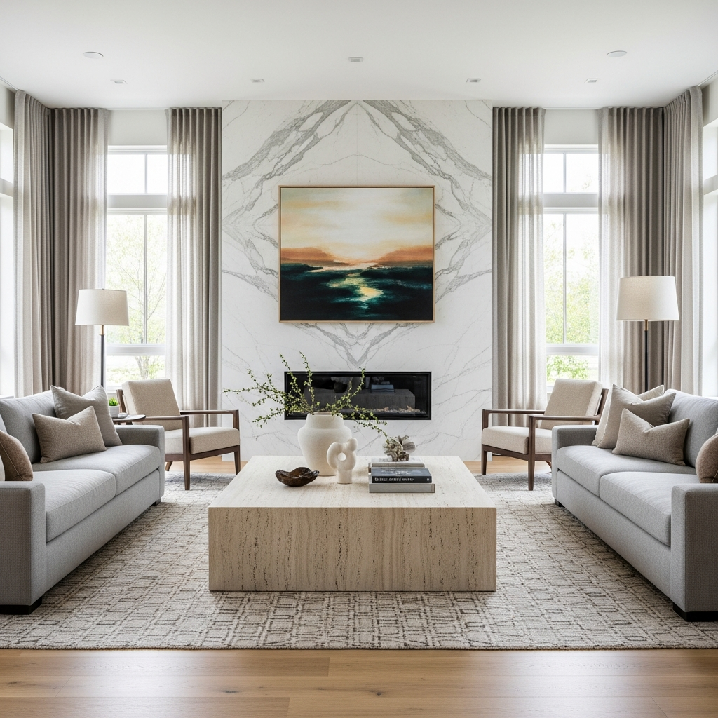 The use of marble, travertine, and onyx is expanding beyond the kitchen and bathroom. In the modern living room, these materials appear in coffee tables, fireplace surrounds, and even wall cladding, offering a timeless sense of luxury.