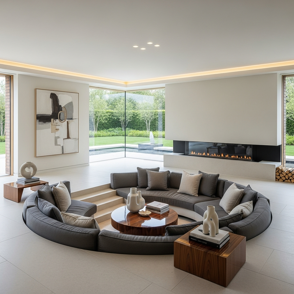 Inspired by 1970s architecture, conversation pits or sunken seating areas are returning to large modern homes. These areas encourage intimacy and social interaction by physically defining the lounge space as a separate zone within the floor plan.