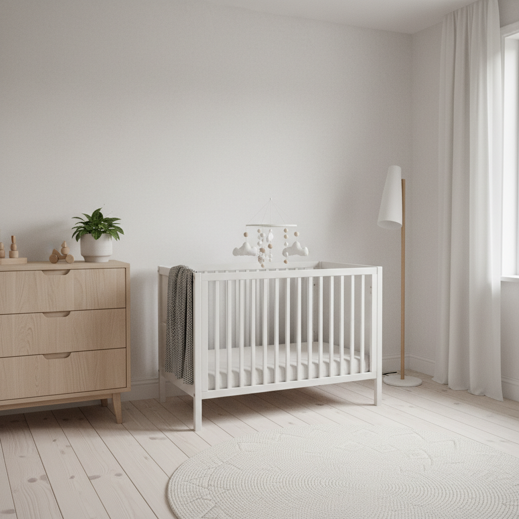Embrace the elegant simplicity and serene beauty of a Nordic Winter Whites nursery. This design draws inspiration from minimalist Scandinavian aesthetics and the tranquil purity of a winter landscape. The color palette is crisp and clean, dominated by pure white, icy blue, light gray, and natural wood tones. Materials are chosen for their warmth and texture: faux fur throws, wool knits, birchwood furniture, and minimalist cotton or linen textiles. Furniture features clean lines and functional design; a sleek white crib, a simple dresser, and perhaps a small, round rug. Delicate snowflake motifs or minimalist animal illustrations can add a touch of charm without overwhelming the space. The overall mood is one of crisp purity, calm, and understated elegance, creating a serene environment that promotes peaceful contemplation and restful sleep.