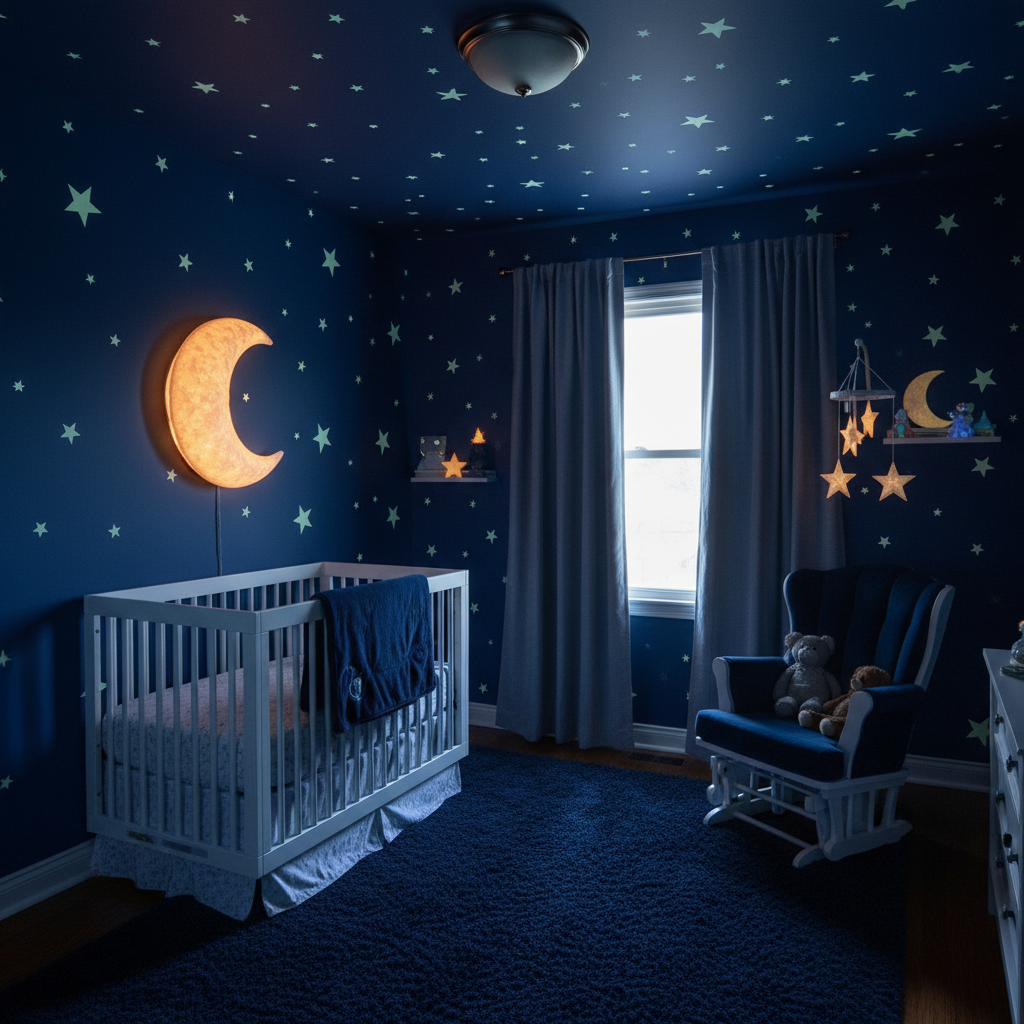 Create a truly magical and calming space with a Starry Night Sky Dream nursery. This enchanting theme draws inspiration from the boundless wonder of the night sky, fostering dreams and peaceful sleep. The color palette features deep navy, midnight blue, silvery grays, crisp white, and subtle touches of gold or iridescent accents. Materials can include luxurious velvets for curtains or an armchair, shimmering fabrics, and glow-in-the-dark stars or constellations on the ceiling. Furniture in dark wood or painted navy will ground the space. A constellation projector can transform the room into an immersive experience. The overall mood is one of magical tranquility, dreamy wonder, and celestial calm, making it an ideal environment for bedtime stories and peaceful slumber. This design encourages a sense of awe and comfort in the vastness of the universe.