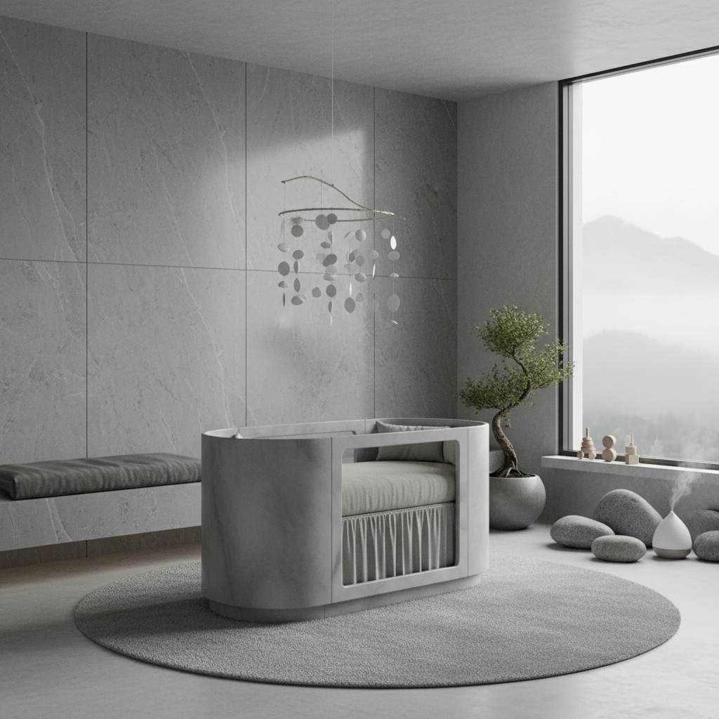 For ultimate serenity and a minimalist aesthetic, consider a Stone and Pebble Zen nursery. This theme draws inspiration from the clean lines and natural elements found in Japanese rock gardens and peaceful landscapes. The color palette is cool and calming: various shades of gray, crisp whites, charcoal, and light wood tones, with very subtle hints of muted green. Materials embrace texture and simplicity: smooth stones (safely integrated), concrete-like finishes, bamboo accents, and linen textiles. Furniture should be simple, clean-lined, and low-profile, such as a minimalist crib and discreet storage solutions. Zen garden elements (out of reach), abstract art, or subtle geometric patterns can enhance the theme. The overall mood is profoundly serene, minimalist, and balanced, creating a tranquil sanctuary that promotes calmness and quiet contemplation.