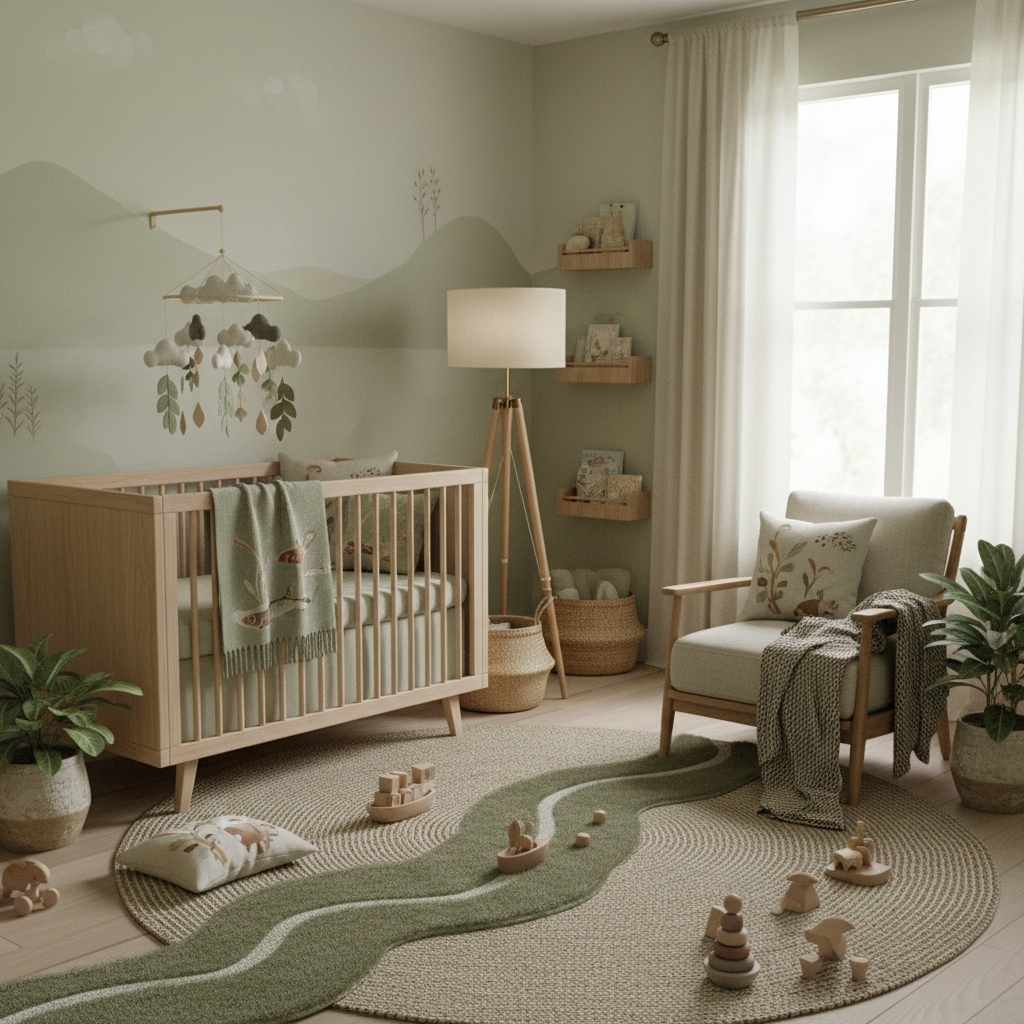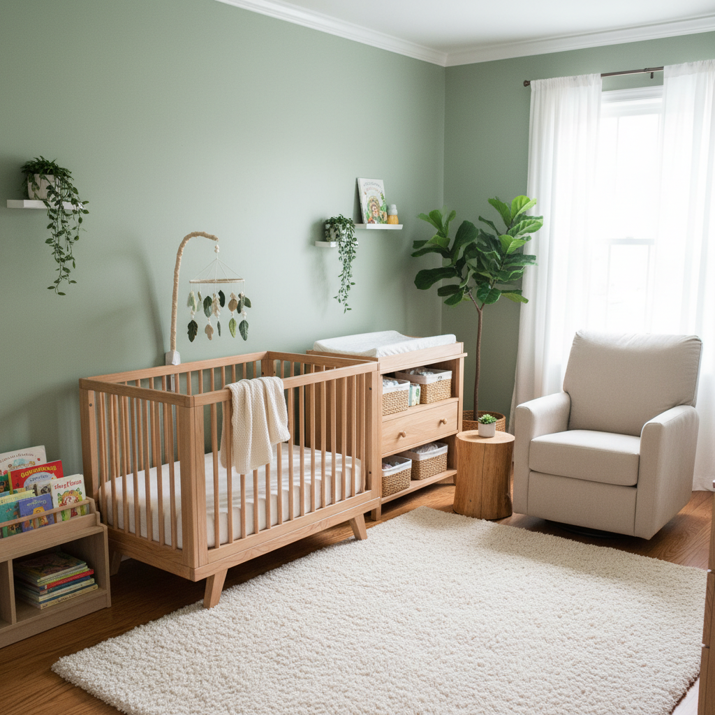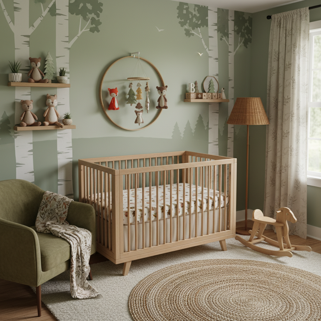 For a truly grounding and harmonious space, a Gentle Forest Greens nursery offers profound tranquility. This theme focuses on the lush, restorative power of a quiet forest. The color palette is dominated by various shades of green—sage, moss, and olive—complemented by creamy whites, light wood tones, and subtle hints of charcoal. Organic materials are key here: organic cotton bedding, linen curtains, and bamboo accents. Furniture should be simple and functional, with clean lines and natural wood finishes, such as a sturdy wooden crib and a matching dresser. A plush green velvet glider can add a touch of comfort and sophistication. The mood is inherently fresh, harmonious, and deeply soothing, creating a sanctuary where your baby can feel connected to nature’s gentle embrace. Botanical prints and a few strategically placed real or faux plants enhance the natural ambiance.