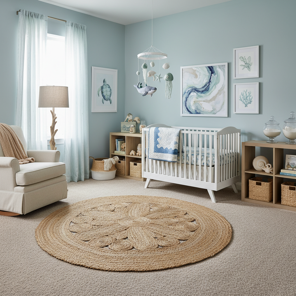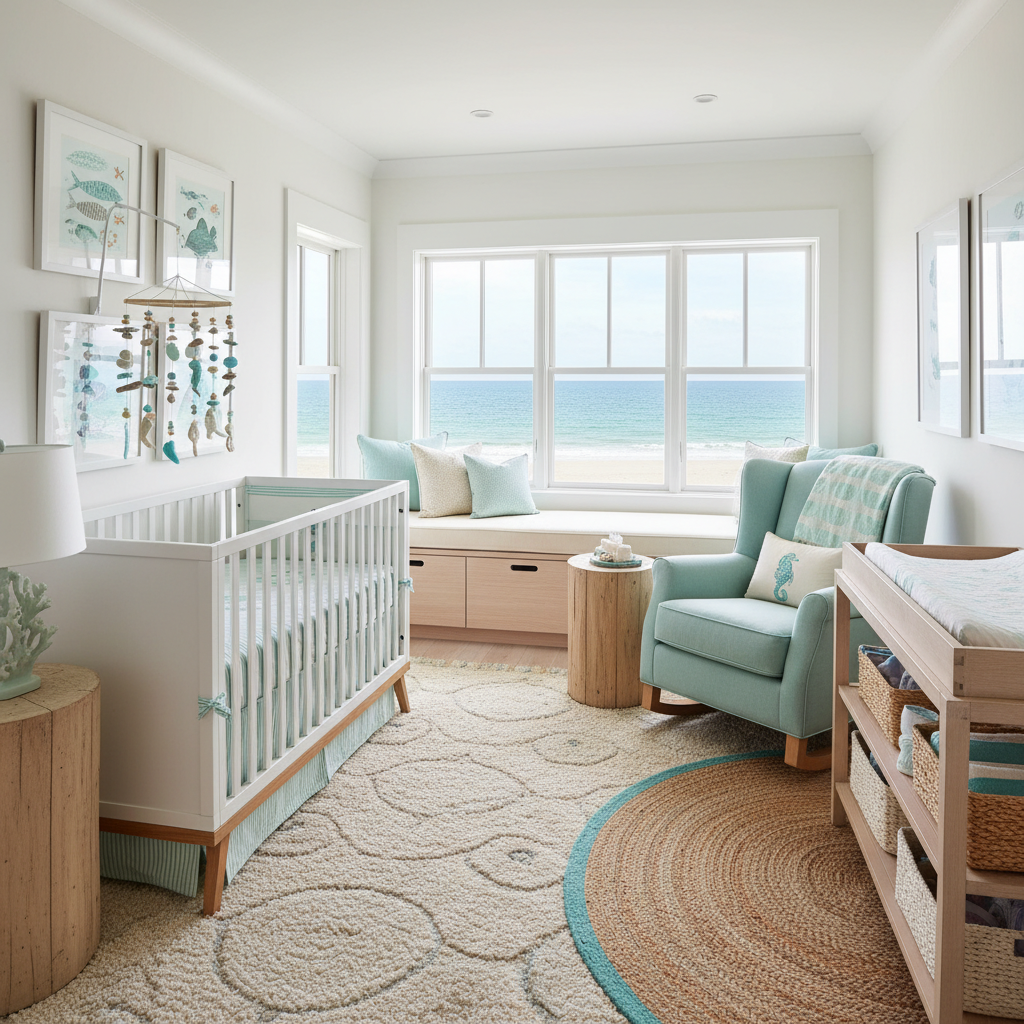 Imagine a gentle sea breeze and the soft sound of waves with a Coastal Breeze Sanctuary nursery. This theme focuses on creating a light, airy, and utterly relaxing space. The color palette is fresh and bright: aqua, sandy tones, crisp white, and driftwood gray. Materials are chosen for their natural, laid-back feel: linen bedding, jute rugs, light wood or whitewashed finishes, and subtle touches of seashells or nautical elements. Furniture should be light and unfussy; a distressed white crib, a simple wooden dresser, and woven storage baskets work beautifully. A mobile with delicate sailboats or seagulls can add a whimsical touch. The overall mood is incredibly fresh, airy, and relaxed, making the room feel open and inviting. It’s a perfect design for a baby’s room, fostering a sense of calm and gentle discovery.
