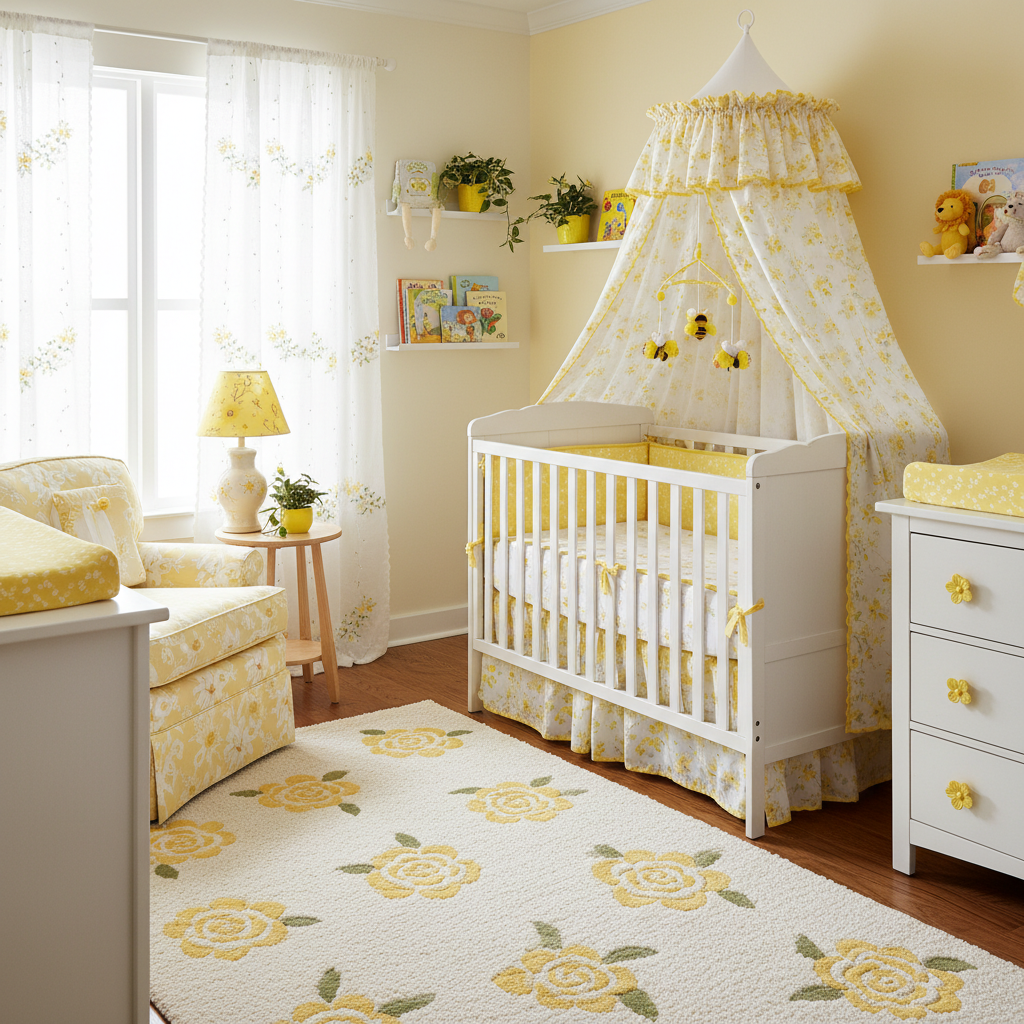 Bring the warmth and cheer of a sun-drenched meadow into the nursery with this delightful theme. The color palette bursts with gentle optimism, featuring soft yellows, pale pinks, sky blues, and crisp whites, all grounded by hints of fresh grass green. Think of wildflowers swaying in a breeze. Materials include light wood, wicker or rattan accents, and textiles with delicate floral or botanical prints. A white or light wood crib, perhaps with a touch of decorative carving, would be ideal. Consider a floral wallpaper accent wall or a mobile featuring butterflies and bees. The overall mood is incredibly cheerful, light, and airy, evoking a sense of innocent joy and boundless possibilities. This design creates a bright, inviting space that feels open and full of gentle energy, perfect for a baby’s early explorations.