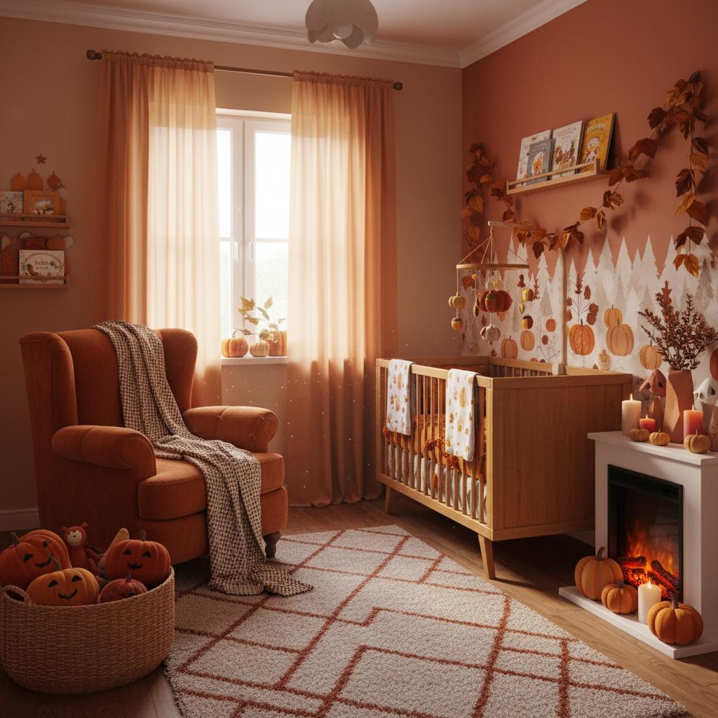 Celebrate the cozy embrace of the changing seasons with an Autumn Harvest Warmth nursery. This theme captures the rich, inviting colors and textures of fall. The color palette is vibrant yet comforting, featuring burnt orange, deep red, golden yellow, forest green, and warm brown. Materials embrace softness and richness: corduroy, velvet, wool knits, and distressed wood finishes. Furniture should feel sturdy and inviting, such as a substantial wooden crib and a plush, cozy armchair perfect for snuggling. Decorative elements like subtle pumpkin accents (out of reach), dried flower arrangements, or leaf motifs can enhance the theme. The overall mood is wonderfully cozy, inviting, and nostalgic, creating a secure and warm environment. This design feels like a perpetual hug, offering comfort and beauty for your baby.