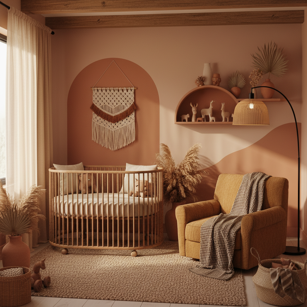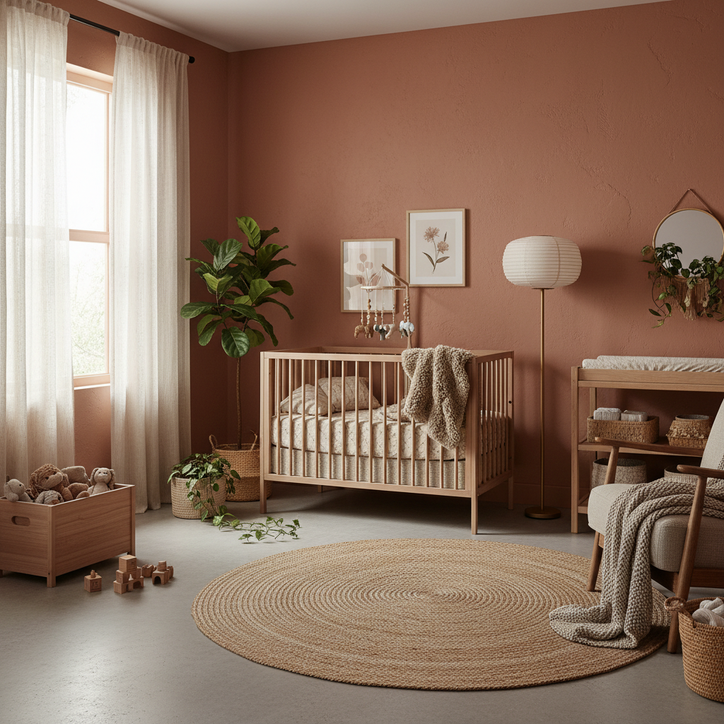 Embrace the grounding warmth of the earth with an Earthy Terracotta Tones nursery. This theme draws on the rich, sun-baked hues of clay and desert landscapes, creating a deeply comforting and natural space. The color palette features burnt orange, rust, clay, warm beige, and soft olive green. Materials are tactile and organic: linen bedding, raw wood furniture, ceramic decorative pieces (out of reach), and woven textures like macrame or jute rugs. Furniture should be simple and low-slung, perhaps a natural wooden crib or a simple dresser. Consider a textured accent wall or art featuring abstract forms inspired by natural landscapes. The overall mood is grounding, warm, and natural, evoking a sense of connection to the earth. This design feels wonderfully rustic yet refined, offering a peaceful and nurturing environment.