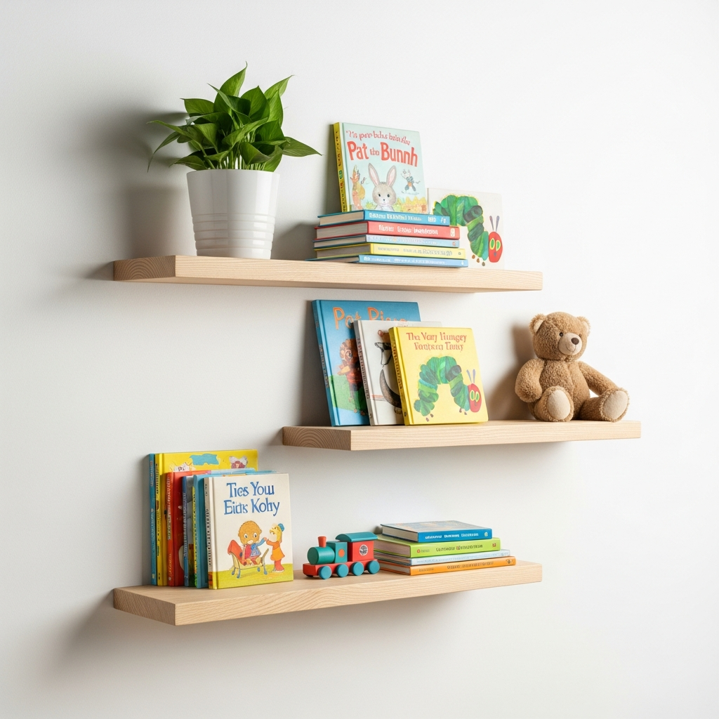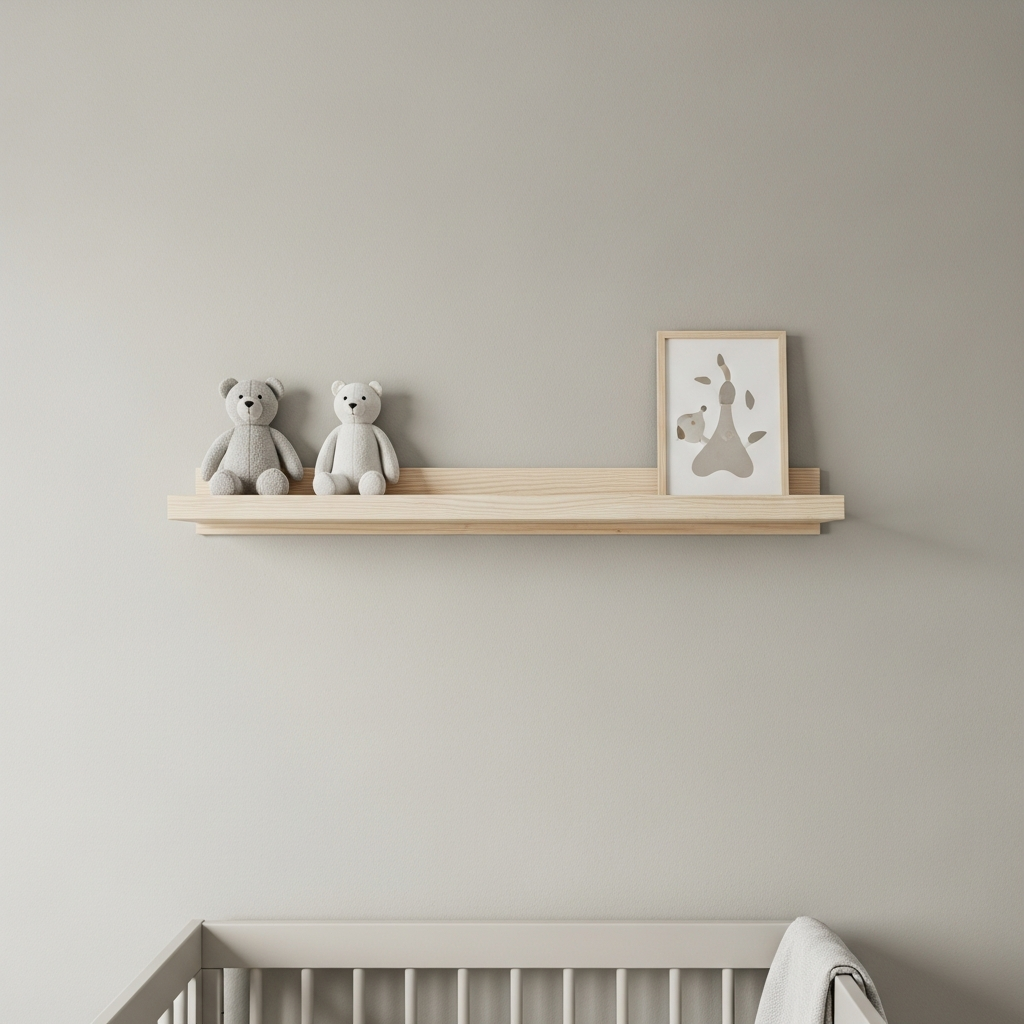 Install light wood floating shelves to display books and small mementos. This keeps the floor clear and allows you to rotate decor items easily as your baby grows.