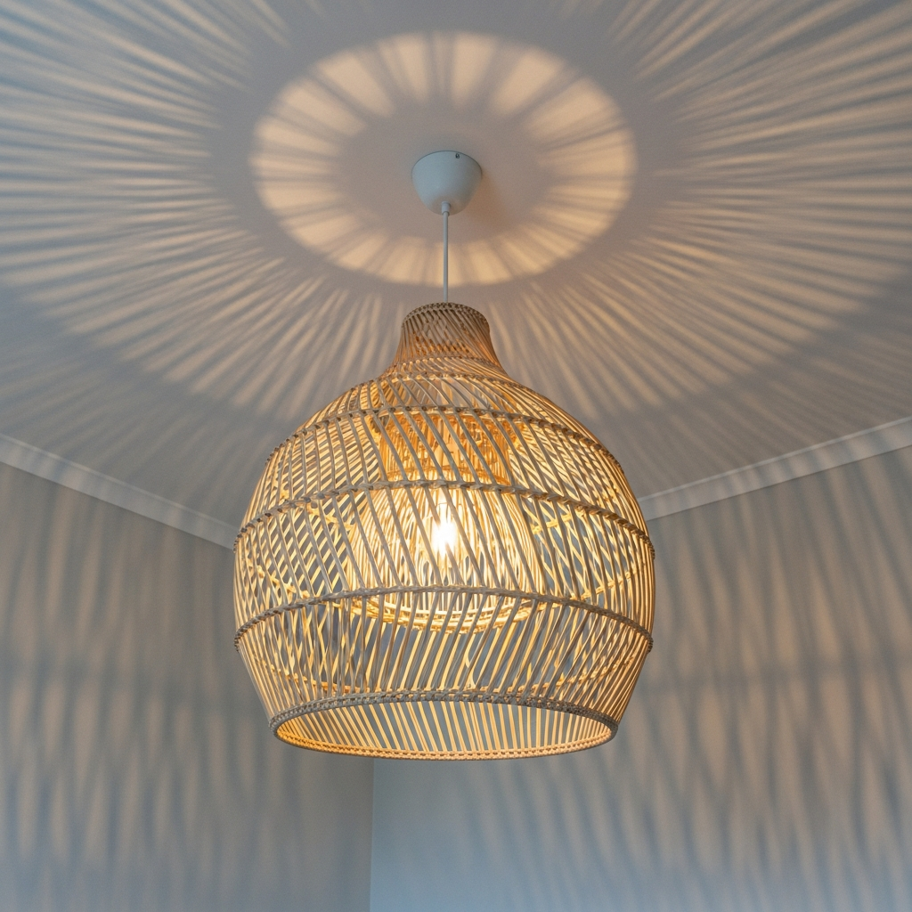 A rattan pendant light creates beautiful shadow patterns and adds an organic shape to the ceiling. It’s a great way to bring in a natural element that feels both vintage and modern.