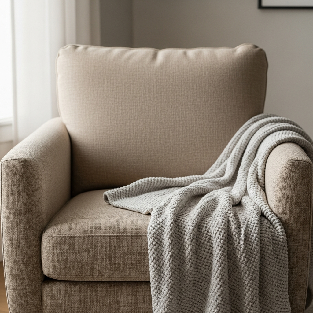 Incorporate soft gray through knit blankets or upholstered furniture. Gray provides a cool contrast to warm beiges and helps to ground the lighter elements of the room.