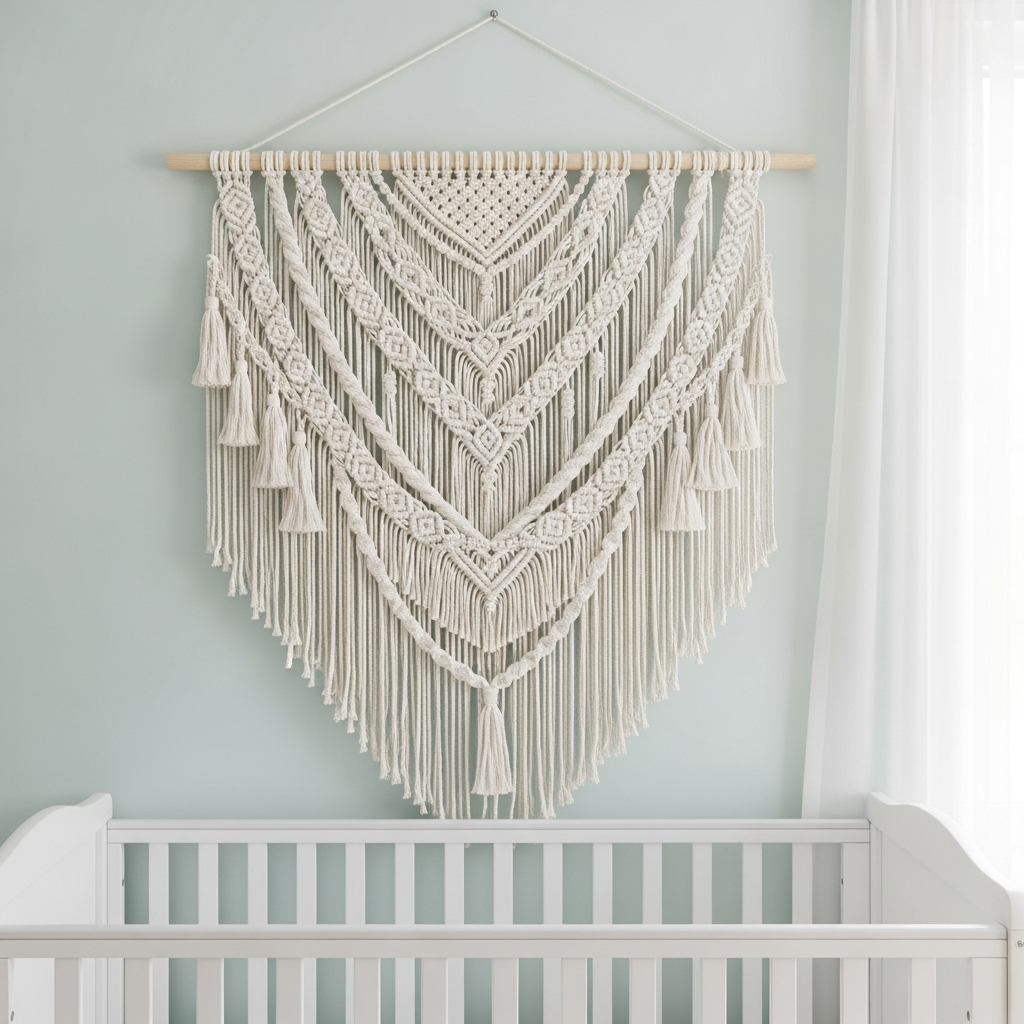 Macrame wall hangings add a bohemian flair to a neutral nursery. The intricate knots and soft cotton cord provide a soft, artistic focal point that doesn’t overwhelm the room’s palette.