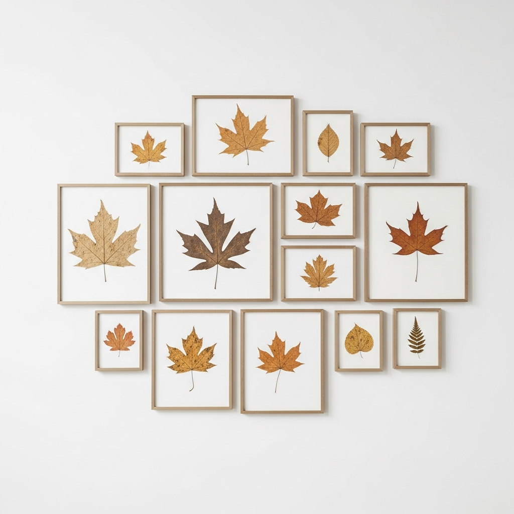 For a subtle nature theme, use framed pressed leaves or flowers. The muted greens and browns of the dried plants fit perfectly within a neutral color scheme while adding a touch of life.