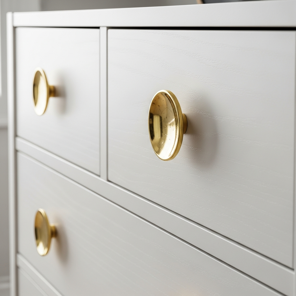 Swap out standard dresser knobs for brass hardware. The metallic warmth of brass complements neutral tones beautifully and adds a hint of luxury to the nursery furniture.