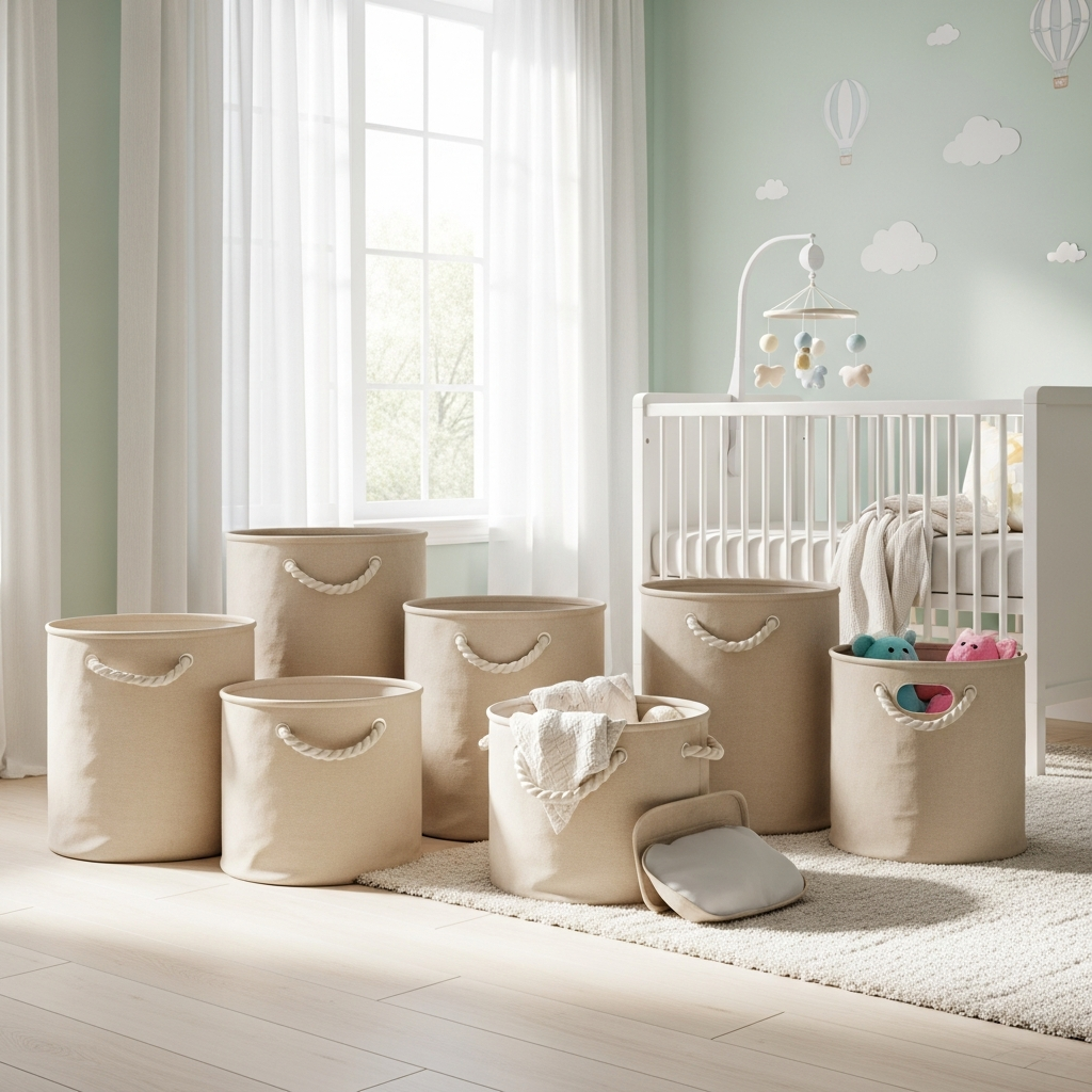 Soft canvas bins are a safer and softer alternative to plastic bins. Choose them in oatmeal or off-white to keep the storage looking clean and cohesive with the rest of the room.