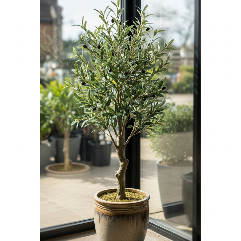 A faux olive tree adds height and a touch of greenery. The dusty green leaves are subtle enough to fit into a neutral palette while bringing an organic vitality to the corner.
