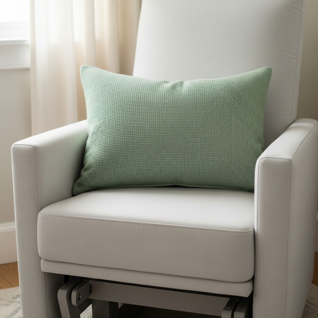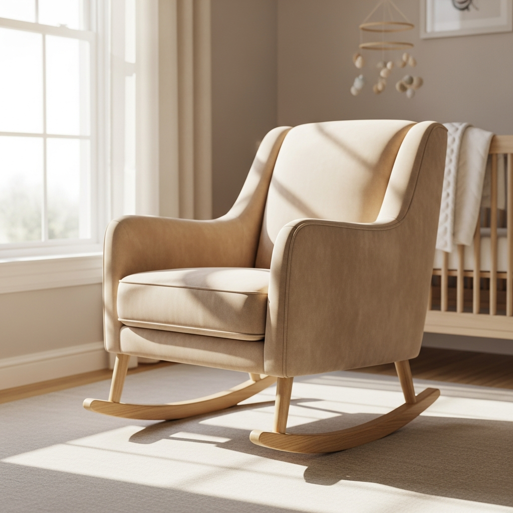 A velvet rocking chair in a champagne or soft sand color adds a touch of opulence. The fabric is durable and incredibly soft, making it the perfect centerpiece for a cozy nursery.