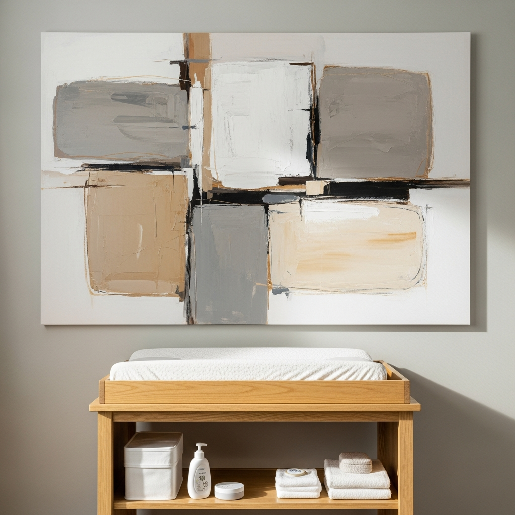 Abstract art in muted tones like taupe, sand, and charcoal can add a modern edge. These prints offer visual stimulation for the baby without being overly bright or distracting.