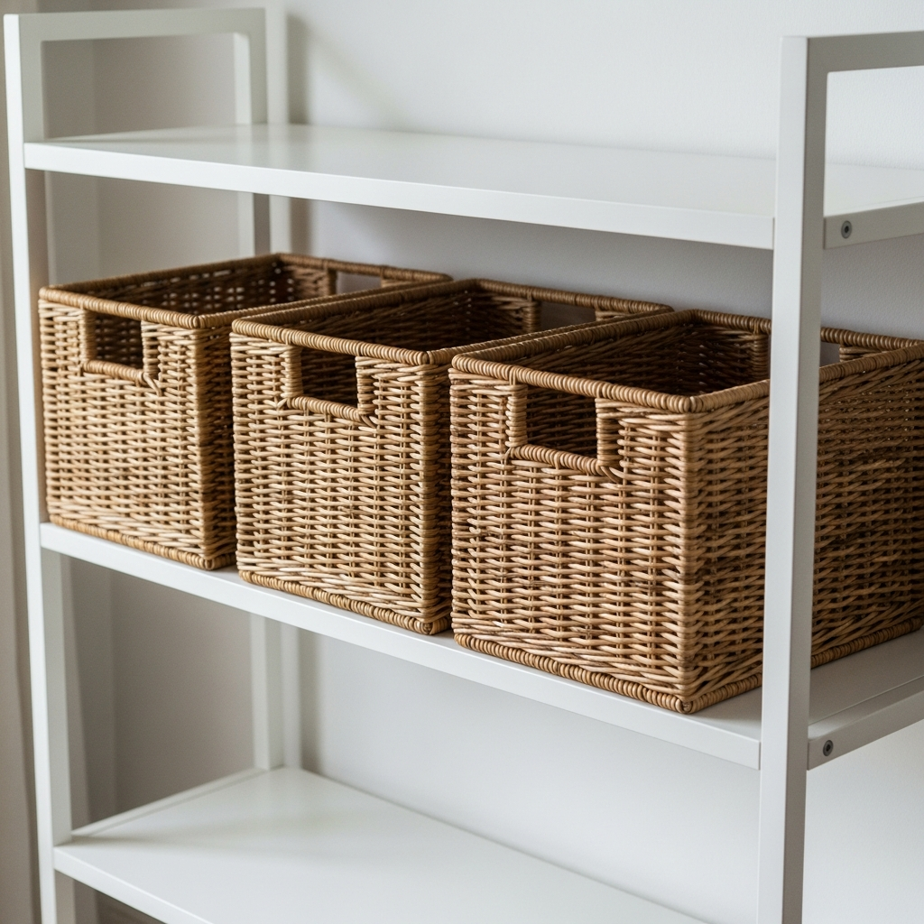 Keep the nursery organized with wicker baskets. They are perfect for storing diapers, toys, and blankets while adding a classic, handmade feel to the storage solutions.