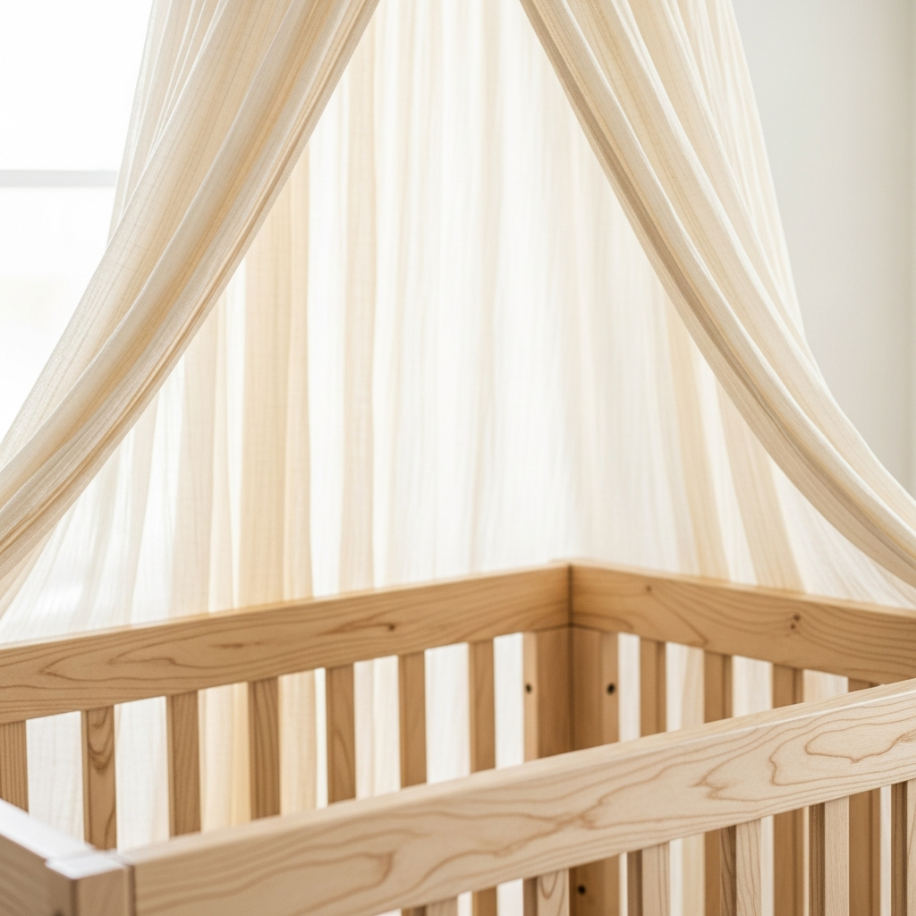 A sheer or cotton canopy creates a cozy, whimsical nook. Choosing a canopy in a light neutral shade ensures the room feels dreamy rather than heavy or cluttered.