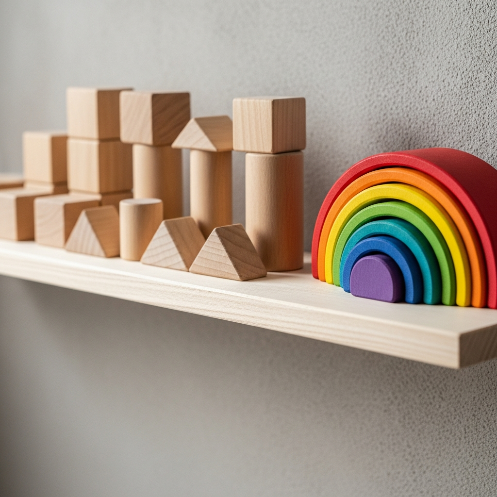 Use wooden toys as decor by displaying them on open shelving. This keeps the space functional and beautiful, as high-quality wooden toys naturally fit a neutral aesthetic.