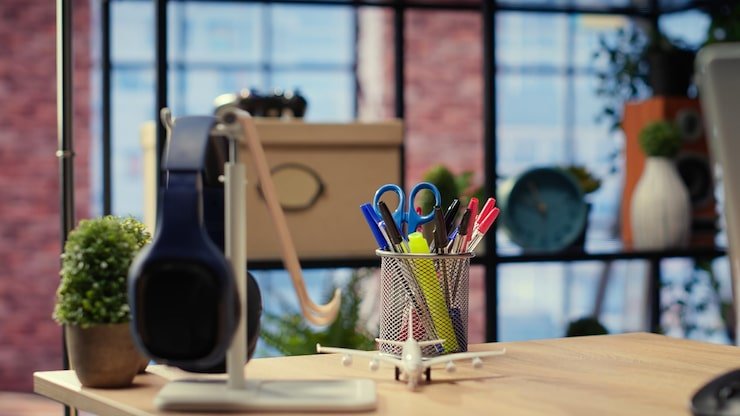 If natural light isn’t available, invest in warm, white LED lighting — bright enough for productivity but soft enough to avoid eye strain. A good desk lamp is essential for evening work or cloudy days.