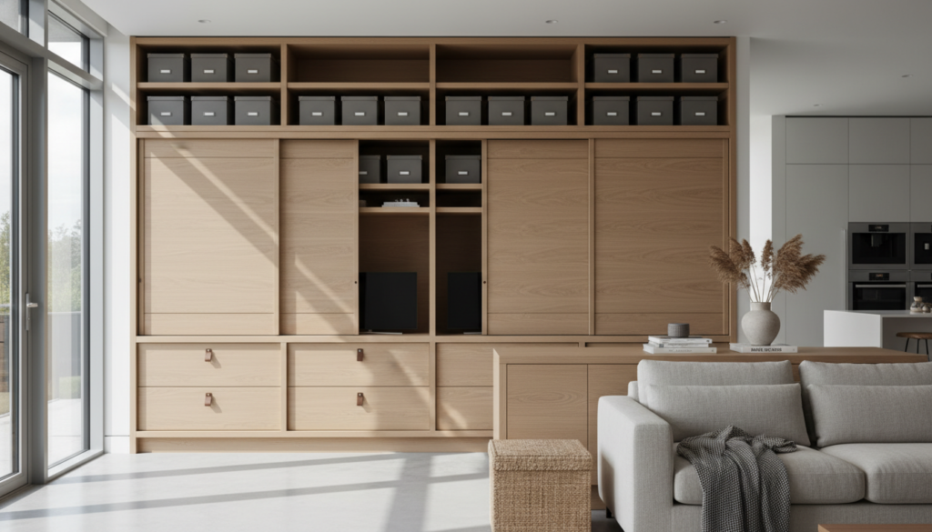 Use furniture with built-in storage — ottomans, sideboards, or benches — to hide everyday items. Add woven baskets or decorative boxes to keep things organized.