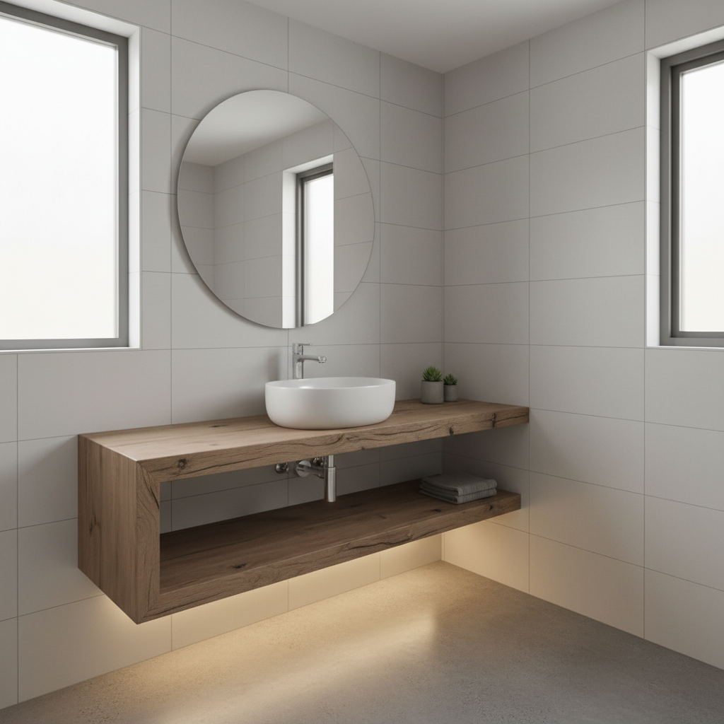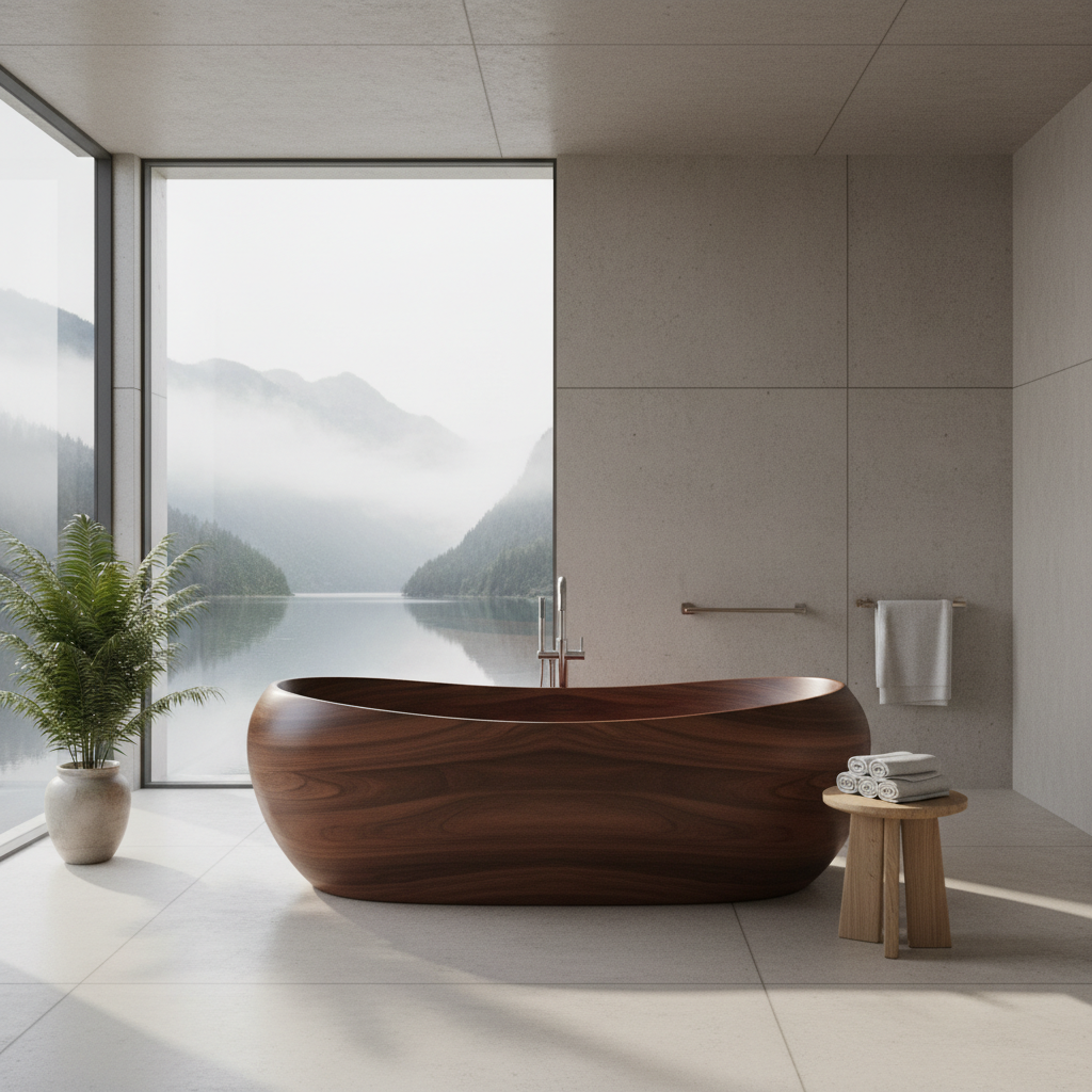 Make a bold statement with a beautifully crafted sculptural wooden bathtub, perhaps made from teak, cedar, or oak. Its organic form and warm material become the undeniable centerpiece of the bathroom. The surrounding elements are kept exceptionally minimalist—plain walls, perhaps a simple concrete or microcement floor, and discreet fixtures—to allow the tub’s artistry to shine. This design is for those who appreciate natural materials and desire a truly unique and luxurious bathing experience.