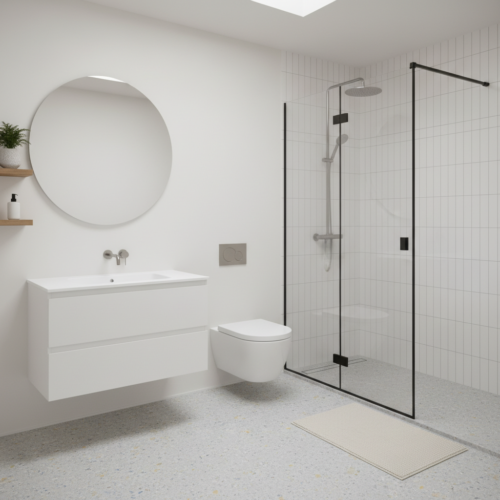 Modern terrazzo, with its subtle flecks of natural stone and aggregates in a light, neutral binder, offers a sophisticated and durable flooring option. It adds texture and visual interest without being overwhelming. This is perfectly complemented by minimalist fixtures—a wall-mounted toilet, a sleek floating vanity, and a frameless glass shower enclosure. The palette remains light and airy, allowing the terrazzo to be a quiet hero. The result is a clean, contemporary space that feels effortlessly chic and inviting.