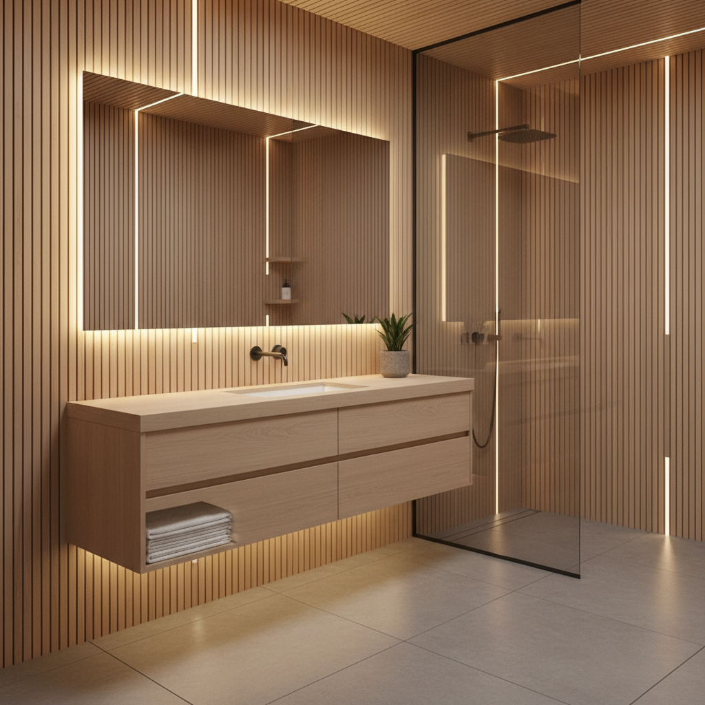 Slatted wood panels, particularly in a light, natural oak or birch, introduce texture, warmth, and a subtle architectural rhythm. These slats can cover an accent wall or even the ceiling, drawing the eye and adding visual interest. Integrated LED lighting, hidden behind or within the slats, creates a soft, ambient glow, highlighting the wood grain and enhancing the spa-like mood. A minimalist floating vanity and simple fixtures keep the focus on the beautiful wood, creating a space that feels both modern and inherently calming.
