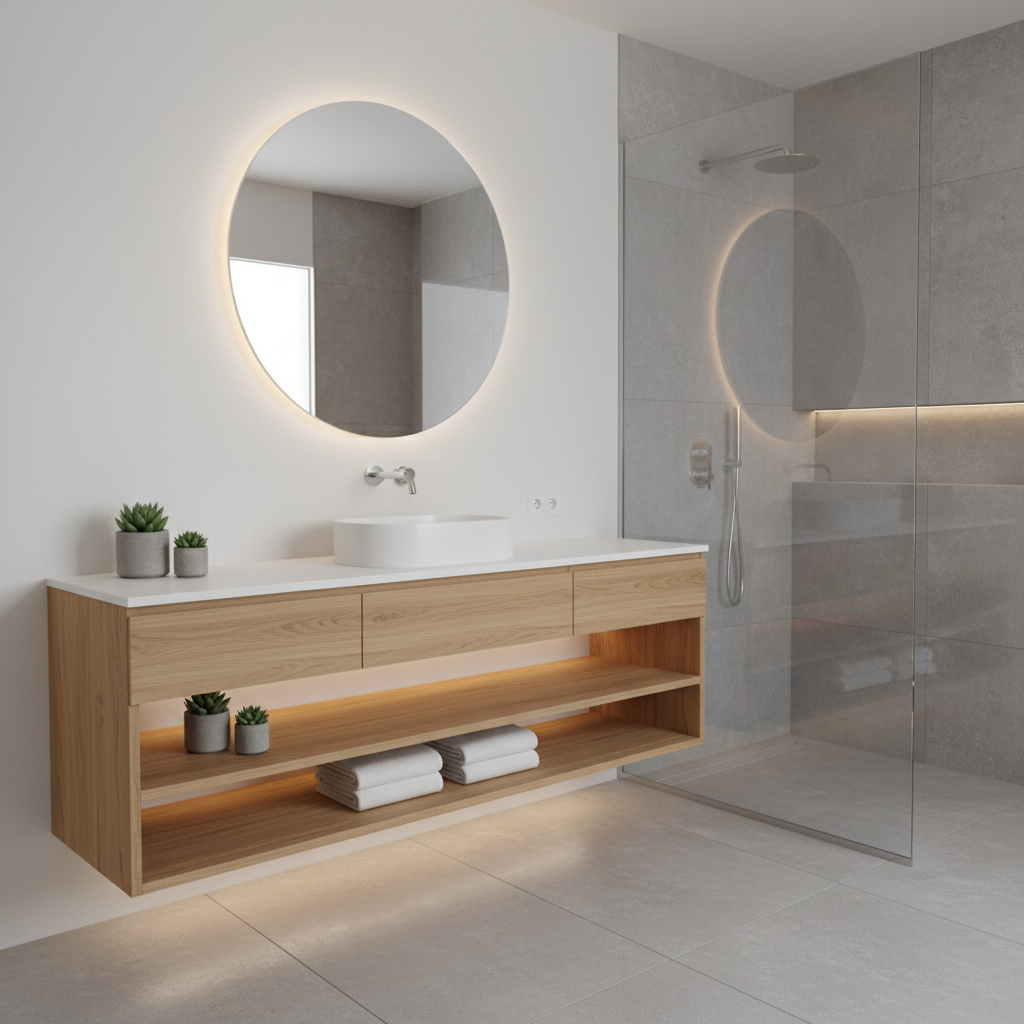 Creating a sense of lightness and spaciousness is key in this design. Floating vanities, wall-mounted toilets, and even suspended mirrors contribute to an airy feel, making the room appear larger and more open. Open shelving, perhaps with neatly folded towels or curated natural decor items, adds a touch of accessible luxury and maintains the uncluttered aesthetic. The choice of materials remains light and natural—pale woods, white ceramics, and soft greys—to enhance the weightless ambiance.