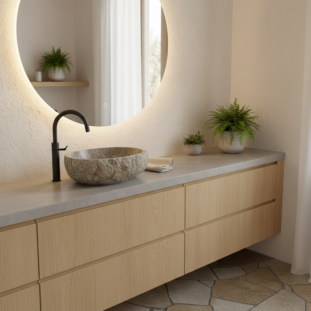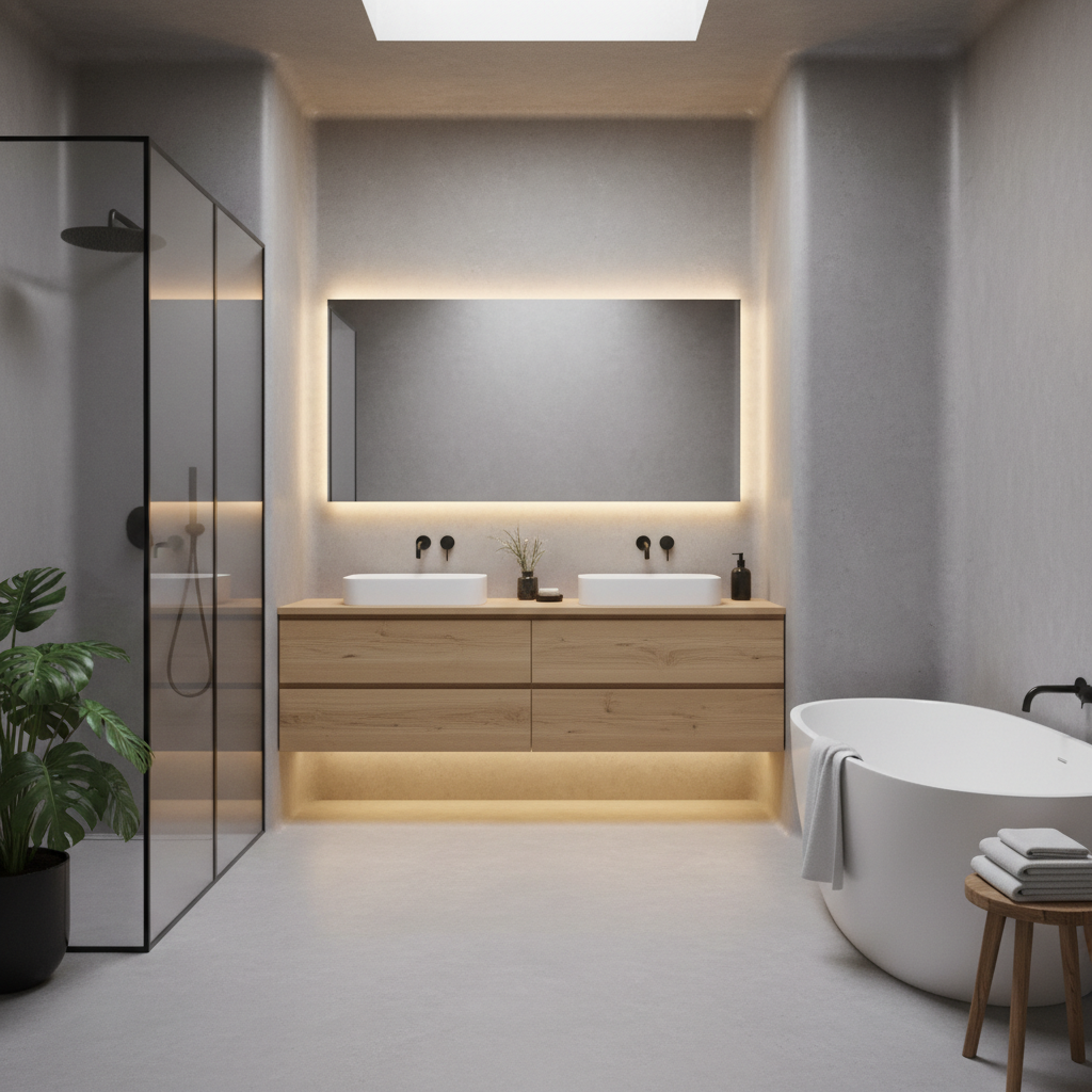 Microcement offers a seamless, minimalist surface for both walls and floors, creating a cohesive and contemporary envelope. Its subtle texture and matte finish in shades of warm grey, beige, or even a muted green provide a sophisticated backdrop. This smooth, continuous surface is beautifully contrasted with the warmth and grain of a substantial wood floating vanity, perhaps in walnut or oak. The combination is sleek, modern, and utterly serene, embodying the organic modern aesthetic.