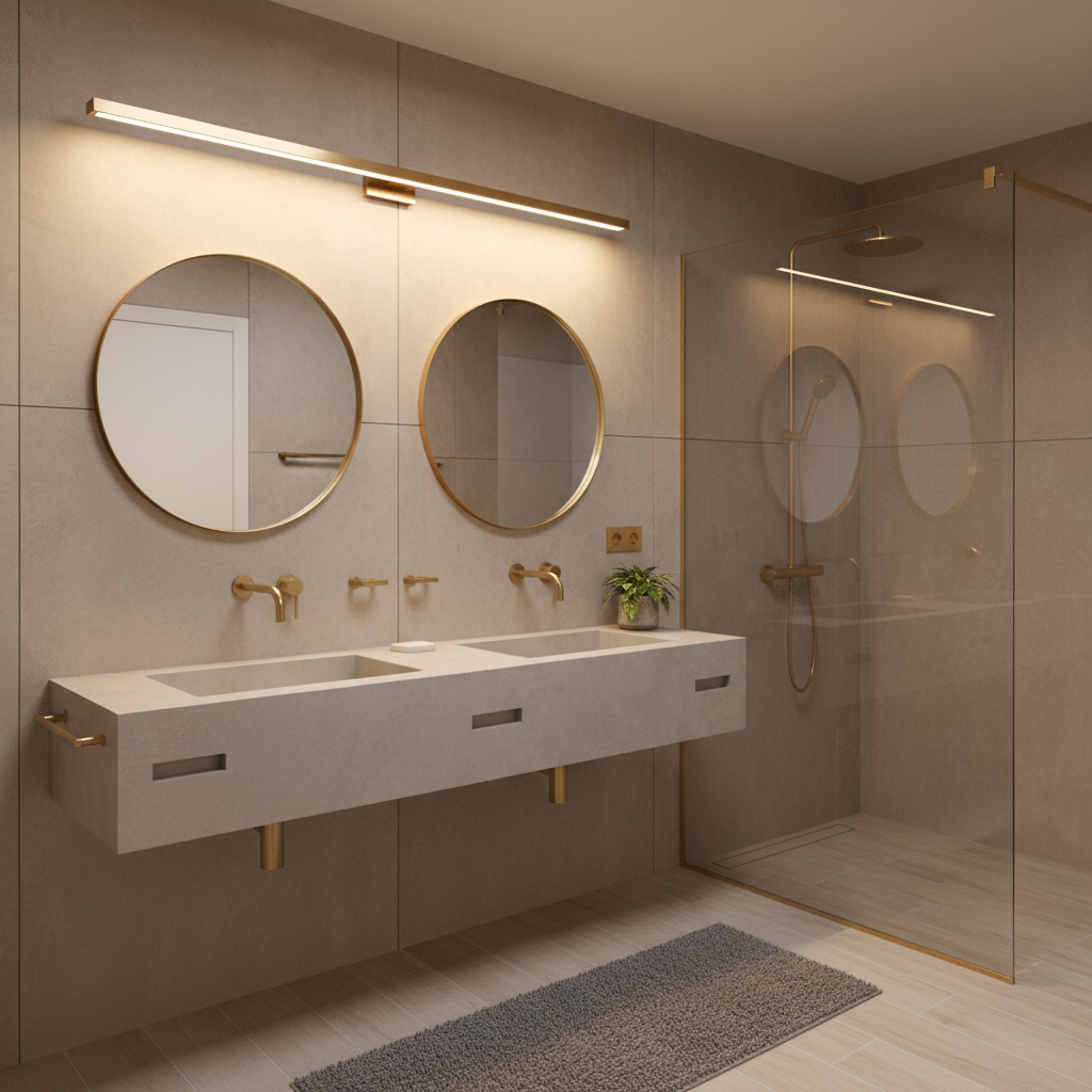 Concrete, often perceived as cold, can be incredibly warm and inviting when used thoughtfully. Here, polished concrete walls and floors in a soft, warm grey create a sophisticated, industrial-chic base. The coolness of the concrete is elegantly balanced by the introduction of brushed brass fixtures—faucets, showerheads, and towel bars—which add a touch of understated luxury and a subtle gleam. A custom-poured concrete sink reinforces the material palette, while a large window allows natural light to soften the strong architectural elements. The mood is refined and contemporary, yet utterly comfortable.