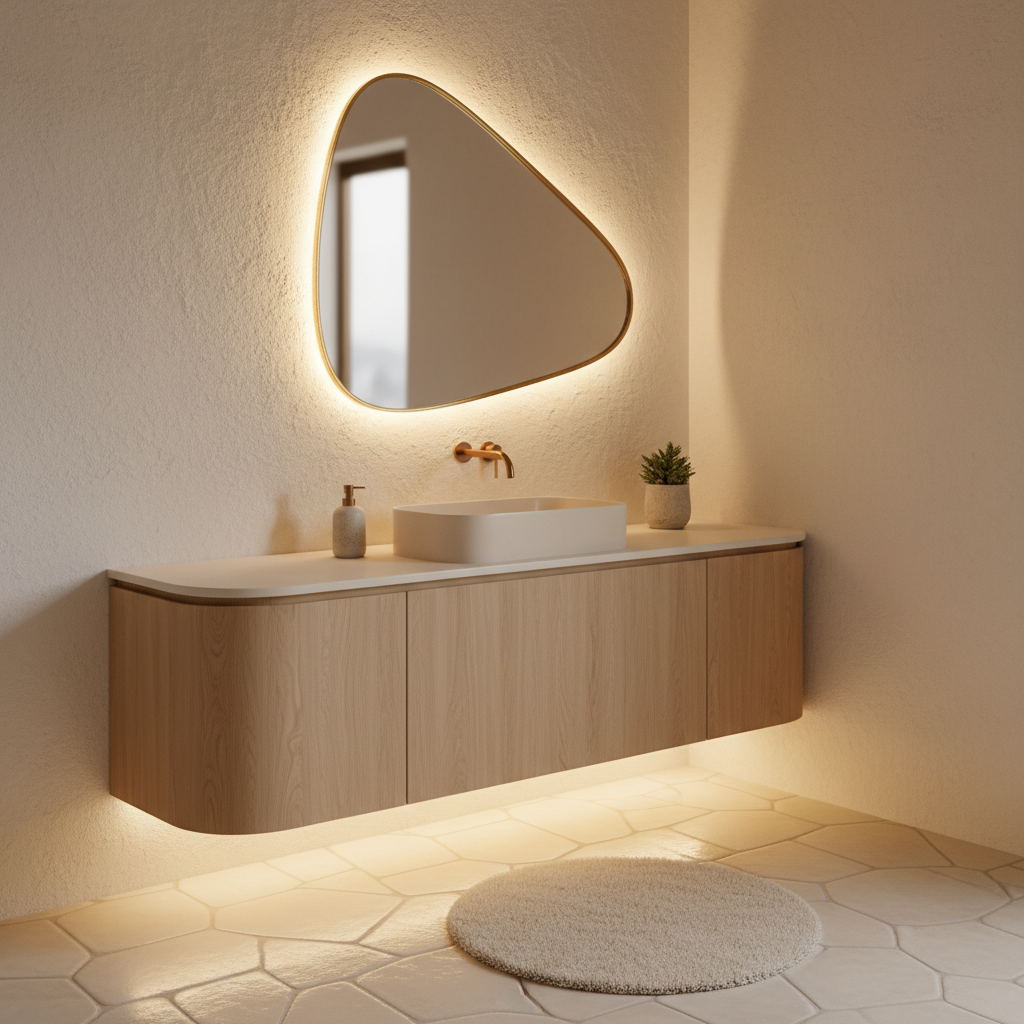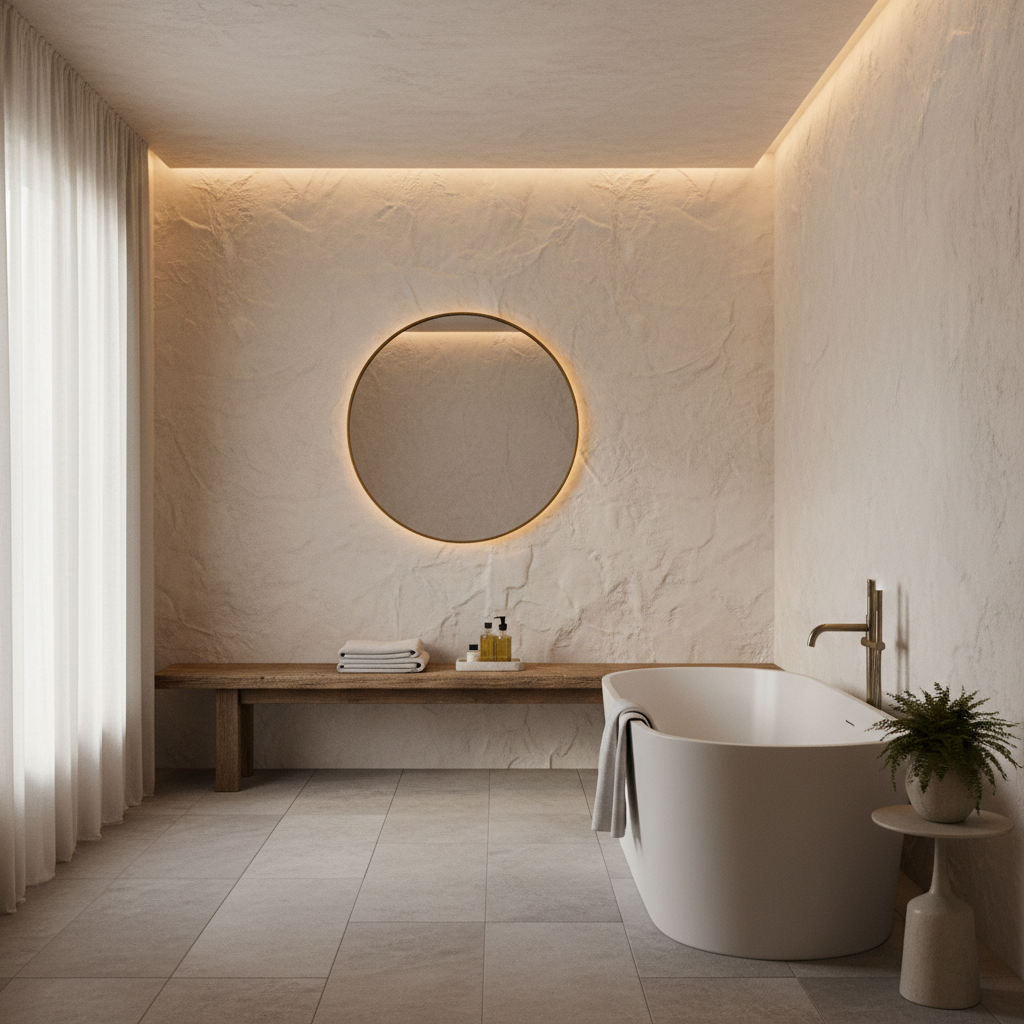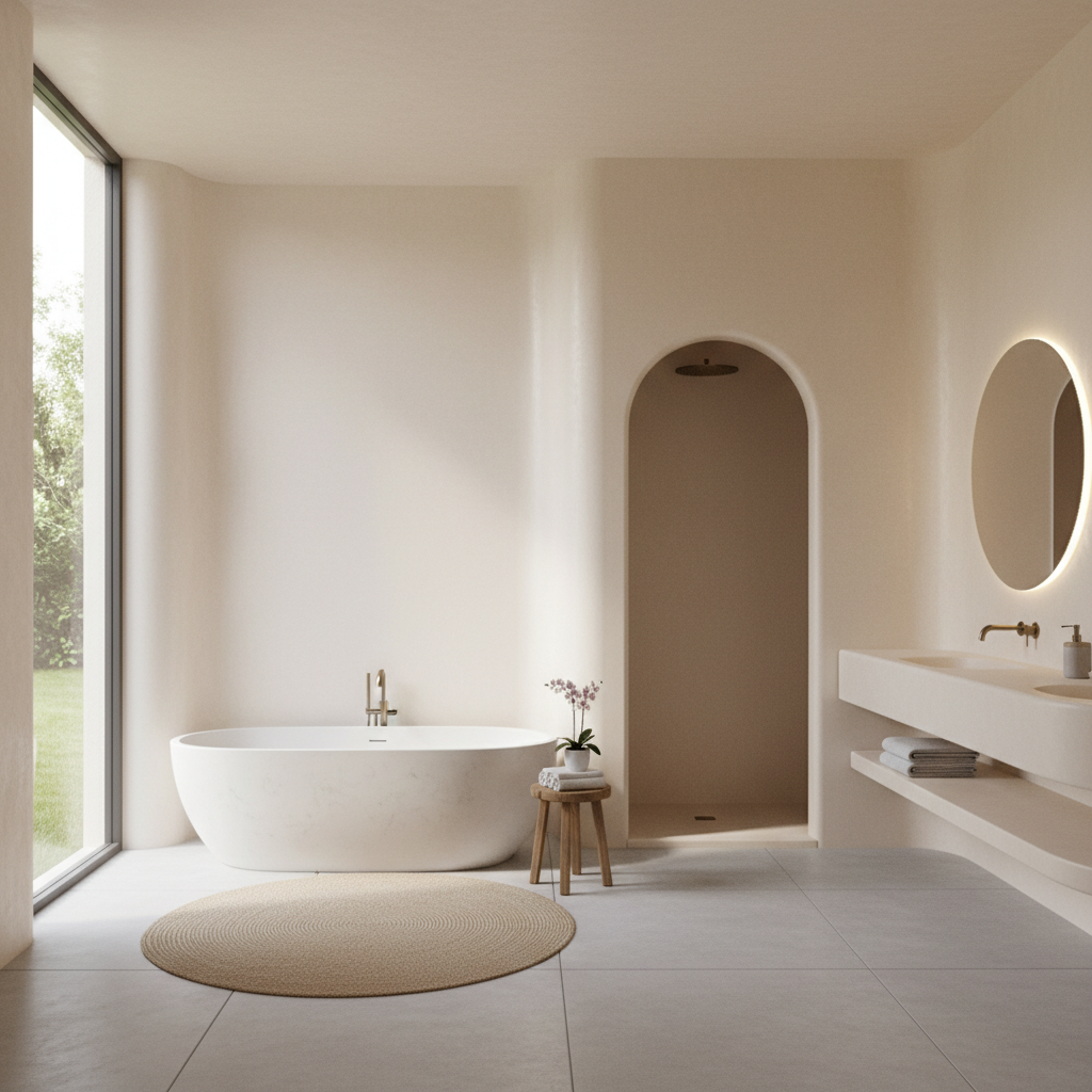 Soft, warm white plaster walls create a seamless, enveloping backdrop, softening any harsh edges and lending an artisanal feel. This aesthetic is paired with furniture and fixtures that feature gentle, organic curves and silhouettes. Think of a vanity with rounded corners, a large, irregularly shaped mirror, or even a curved shower enclosure. These fluid forms introduce a sense of movement and softness, contrasting beautifully with the solid plaster. The overall impression is one of gentle elegance and quiet sophistication, a truly restful space.
