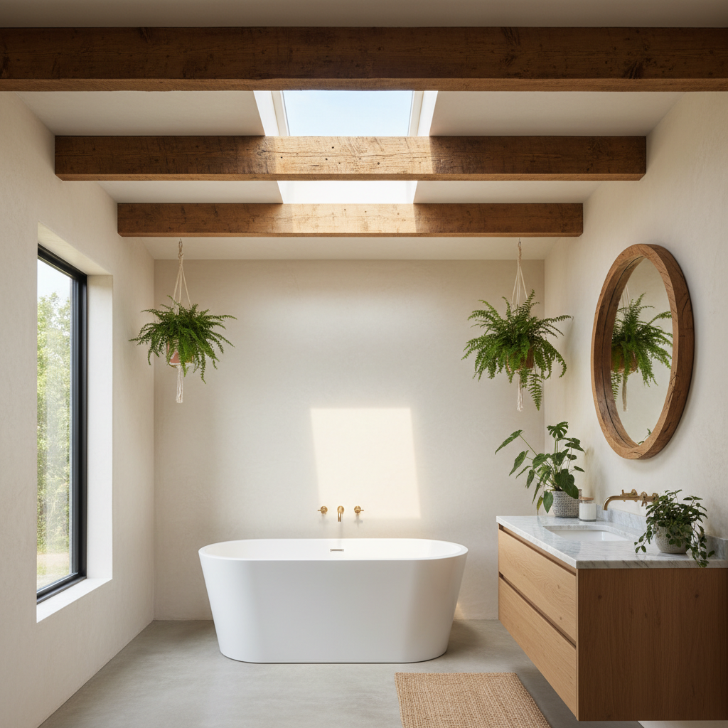 If your home permits, exposing wooden ceiling beams can add incredible architectural character and warmth to an organic modern bathroom. These structural elements bring a rustic, natural touch. Complementing this, a skylight above the freestanding tub or shower floods the space with natural light, creating a bright and airy atmosphere and offering a view of the sky. The combination of raw wood and abundant natural light makes the space feel grounded yet expansive, a truly sublime private spa.