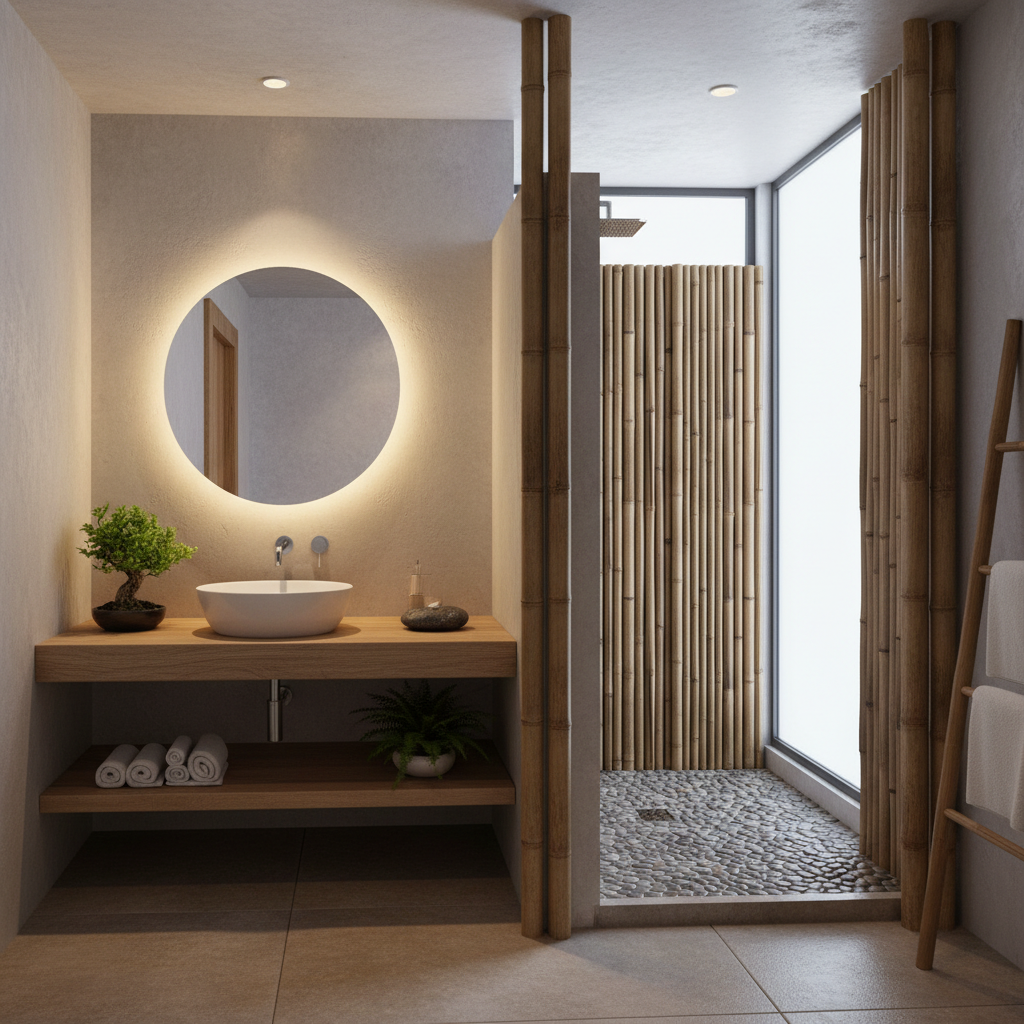 Channeling the tranquility of a Japanese garden, this design features a captivating pebble floor in the shower area, providing a gentle massage underfoot and a strong tactile connection to nature. Smooth, river-like stones are set into a seamless surface. Bamboo elements, perhaps a small stool, a bath caddy, or even a subtle wall panel, introduce a light, natural wood tone and a sense of calm. The rest of the bathroom remains minimalist with clean lines and a muted color palette, emphasizing serenity and mindful living. The overall feeling is one of quiet contemplation and peace.