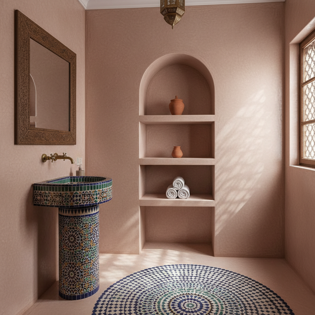 Embrace the ancient beauty of Tadelakt, a traditional Moroccan lime plaster, for seamless, waterproof walls that boast a subtle sheen and organic movement. The hand-applied finish creates a soft, undulating surface in earthy tones like warm beige, soft grey, or even a muted sage. Arched niches or doorways can further enhance the Moroccan spa feel. A handcrafted ceramic basin with intricate patterns or a simple, deep hammered copper sink adds an authentic touch. The atmosphere is exotic yet incredibly soothing, a warm embrace.