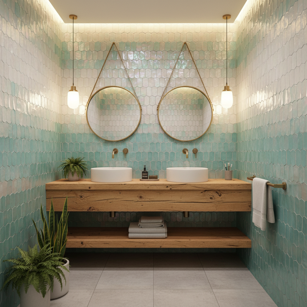 Introduce a touch of artisanal charm with Zellige tiles, the handcrafted Moroccan clay tiles known for their imperfect surfaces and subtle variations in color and sheen. Used on a shower wall or as a backsplash, they catch the light beautifully, creating a dynamic, living surface. Pair these with a warm wood vanity, perhaps in a medium oak or teak, to ground the space. Brushed gold or copper fixtures would enhance the warmth and handcrafted feel, creating a bathroom that feels unique and full of character.