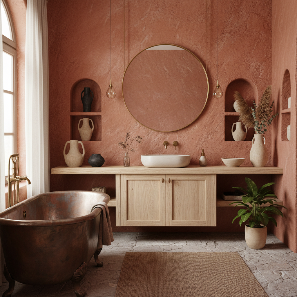 Drawing inspiration from desert landscapes, this design utilizes warm, earthy clay tones for walls or large format tiles, creating an enveloping, grounding feel. The palette might range from soft terracotta to muted rust or sandy beige. Sculptural ceramic elements, such as a handmade basin or decorative vases, add artistic flair and a tactile quality. These pieces often feature organic, imperfect shapes that celebrate craftsmanship. A simple, round mirror with a thin brass or black frame completes the look, reflecting the warm hues and enhancing the spa-like ambiance.