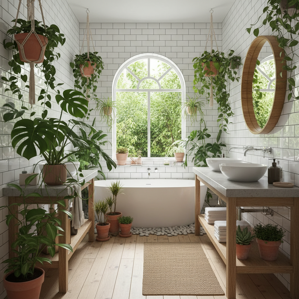 Bring the outdoors in with a truly biophilic design. This bathroom emphasizes a strong connection to nature through abundant greenery. Large potted plants like monsteras or snake plants are strategically placed, perhaps even a vertical garden wall, to create a vibrant, living backdrop. Natural wood elements, such as a slatted wall panel or a teak shower mat, enhance this connection. The color palette remains neutral, allowing the varying shades of green to be the star. The air feels fresh, and the space radiates vitality, making it a refreshing escape.