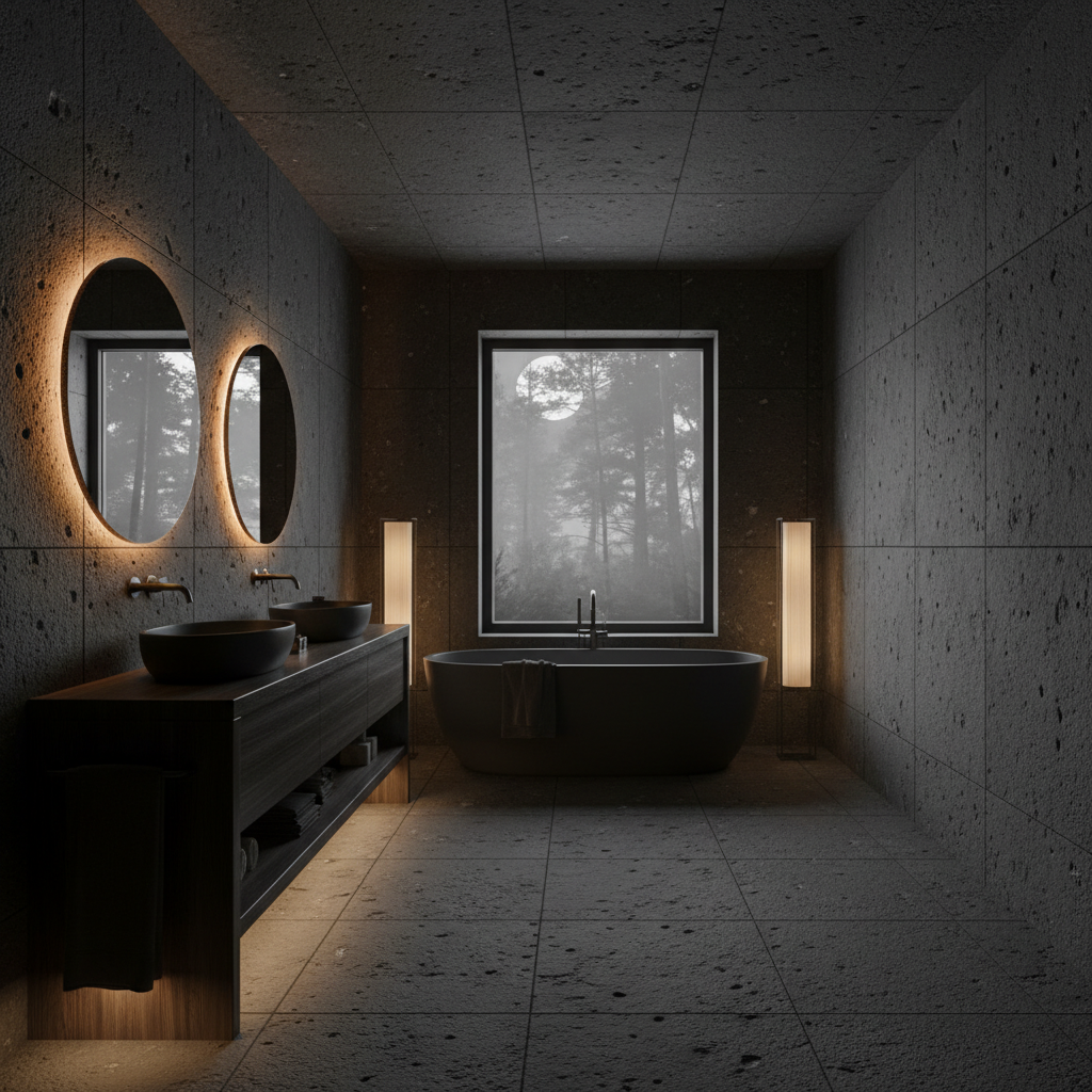 For a more dramatic and grounding organic modern aesthetic, consider dark volcanic stone tiles for floors and accent walls. Their rich, deep texture and often charcoal grey or black hues create a powerful statement. This intensity is softened by the inclusion of dark, rich woods like walnut or wenge for the vanity, adding warmth and sophistication. Strategic, dimmable lighting, perhaps concealed LED strips, enhances the moody, luxurious spa ambiance. The space feels private, intimate, and deeply luxurious, perfect for unwinding.