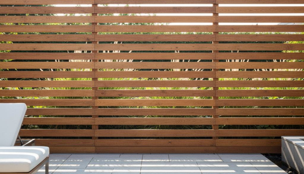 Slatted wood panels provide a modern, minimalist look while allowing some light and air to pass through. Materials like cedar, redwood, or composite wood offer warm tones and natural textures. The mood is chic and contemporary, pairing well with sleek metal furniture and a neutral color scheme.