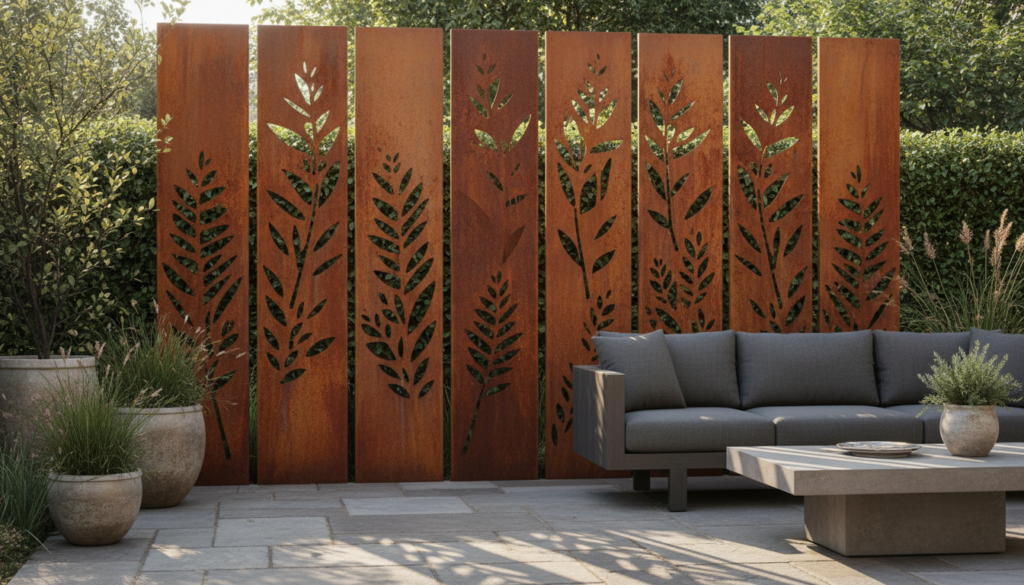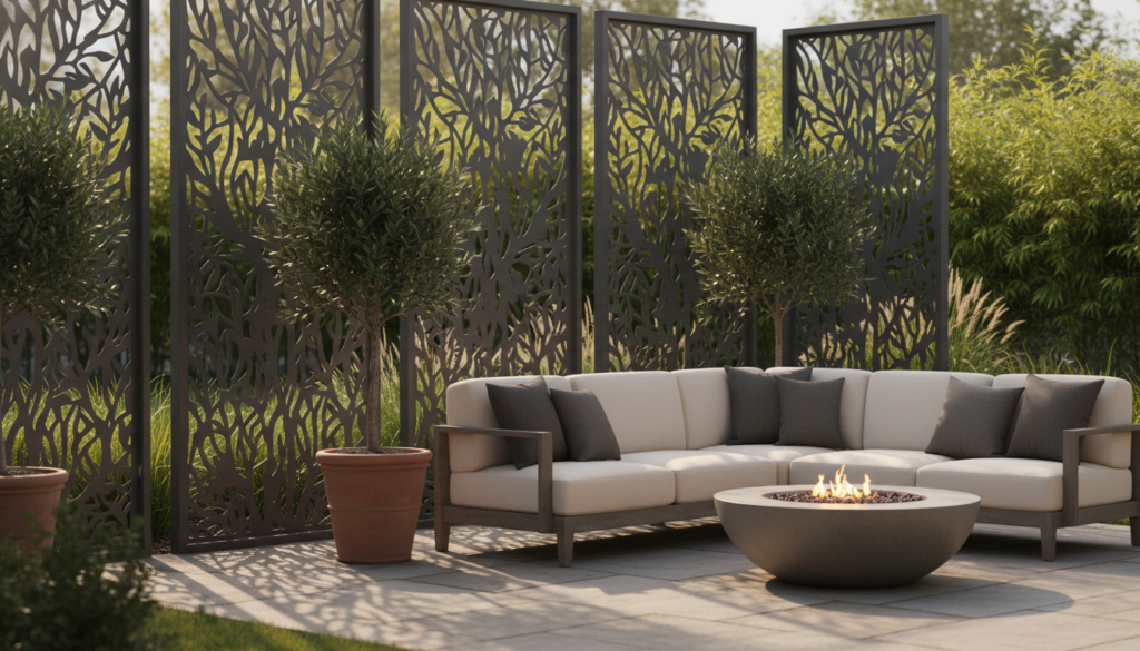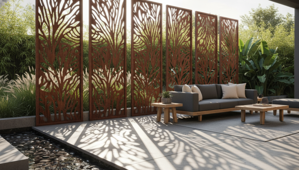 Laser-cut metal screens with intricate patterns add an artistic touch to privacy. Available in steel, aluminum, or corten steel, these screens cast beautiful shadows and can be customized with various designs. The aesthetic is industrial-chic and highly artistic, often featuring a monochromatic or metallic palette.