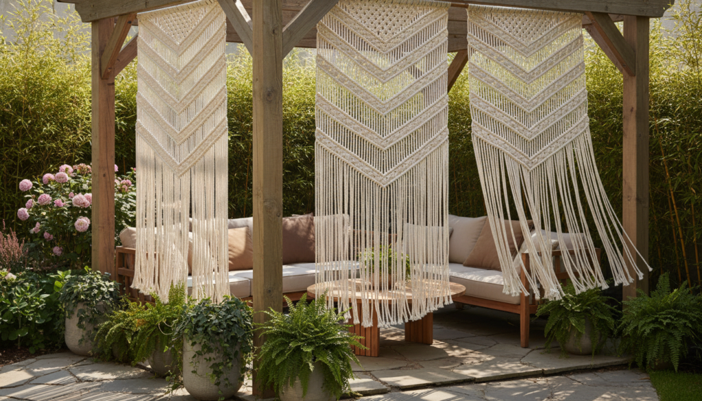 Delicate and artistic, macrame hanging screens offer a soft, decorative privacy solution, particularly for smaller spaces like balconies or patios. The intricate knot work adds a bohemian touch and a sense of lightness. The mood is whimsical and cozy, often in natural off-white or earthy tones.