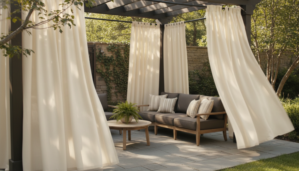 Outdoor curtains, made from weather-resistant fabrics, provide instant privacy and a touch of elegance. They can be drawn open or closed as needed, adding a soft, flowing element to pergolas or patio structures. The mood is luxurious and romantic, often in soft neutrals, grays, or deep jewel tones.