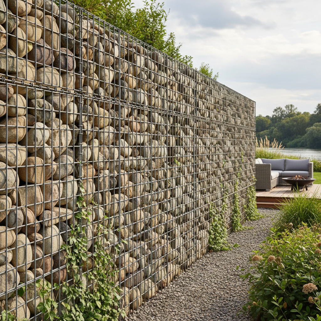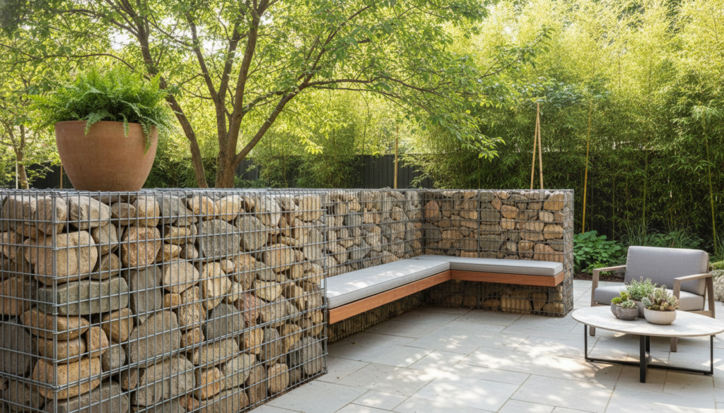 Gabion walls are wire cages filled with rocks, stones, or even wood. They offer a robust, industrial-yet-natural privacy barrier with excellent sound dampening properties. The raw textures of the stones create an earthy, grounded mood, suitable for modern or rustic landscapes.