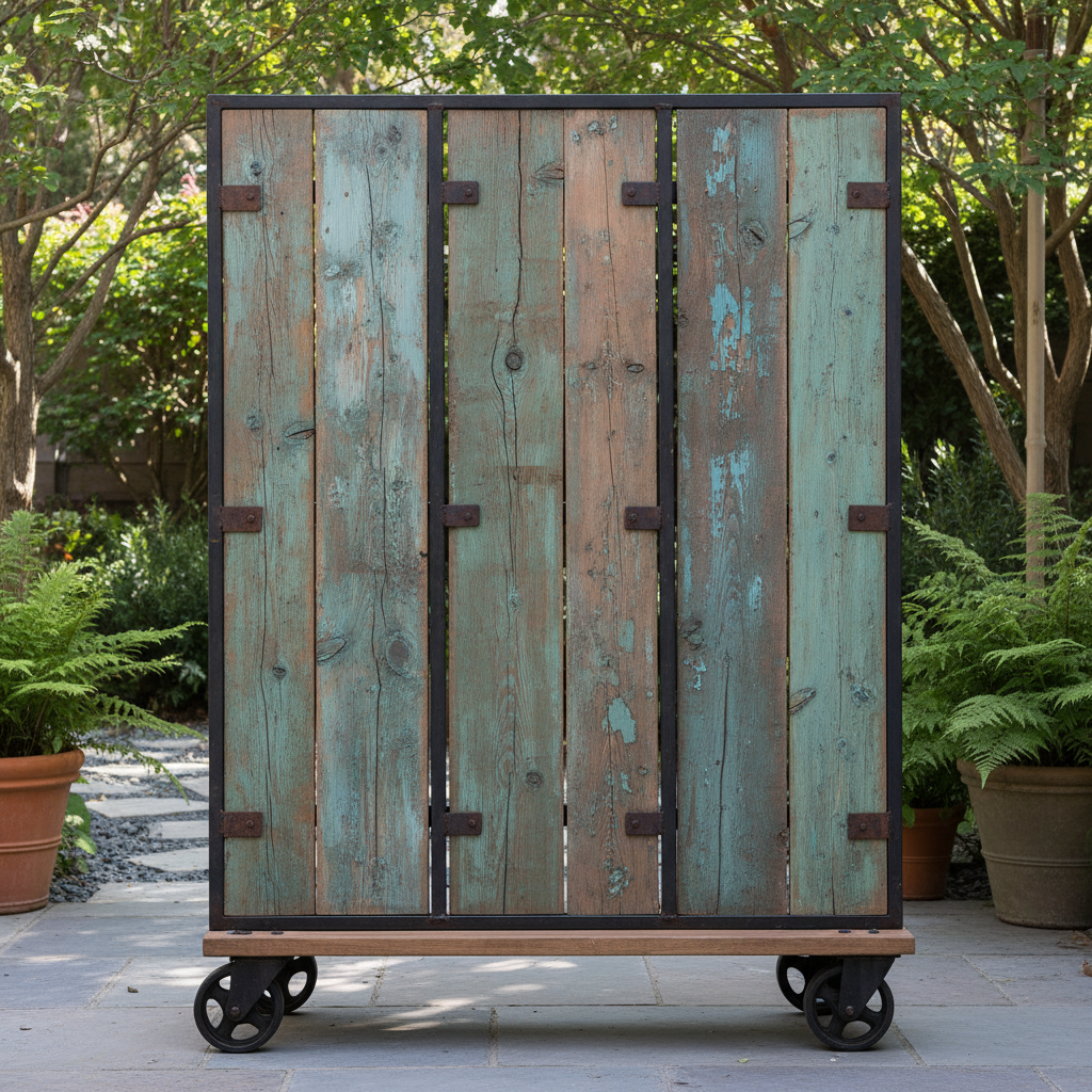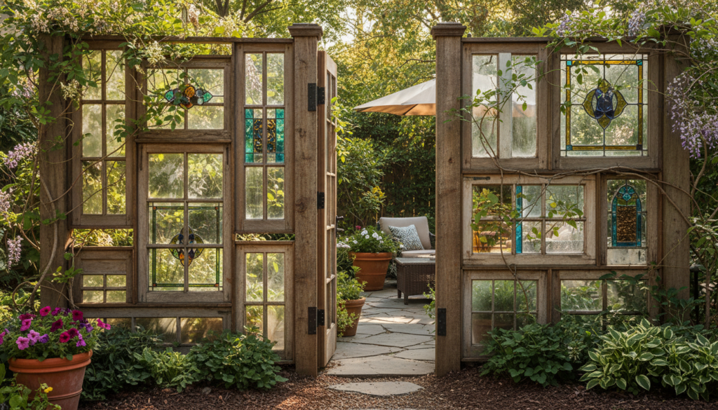 Old window frames, stripped of glass and perhaps painted in vibrant colors, can be linked together to form a charming, eclectic screen. Fill the openings with mirrors, wire mesh, or small planters. The mood is whimsical and vintage-inspired, perfect for a quirky, artistic garden.