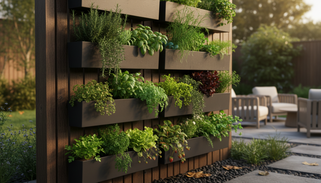 Combine privacy with edible landscaping by creating a vertical garden filled with herbs or small vegetables. A sturdy frame supports multiple tiers of planters, forming a green, fragrant screen. The mood is functional and fresh, with a rustic or farm-to-table aesthetic.