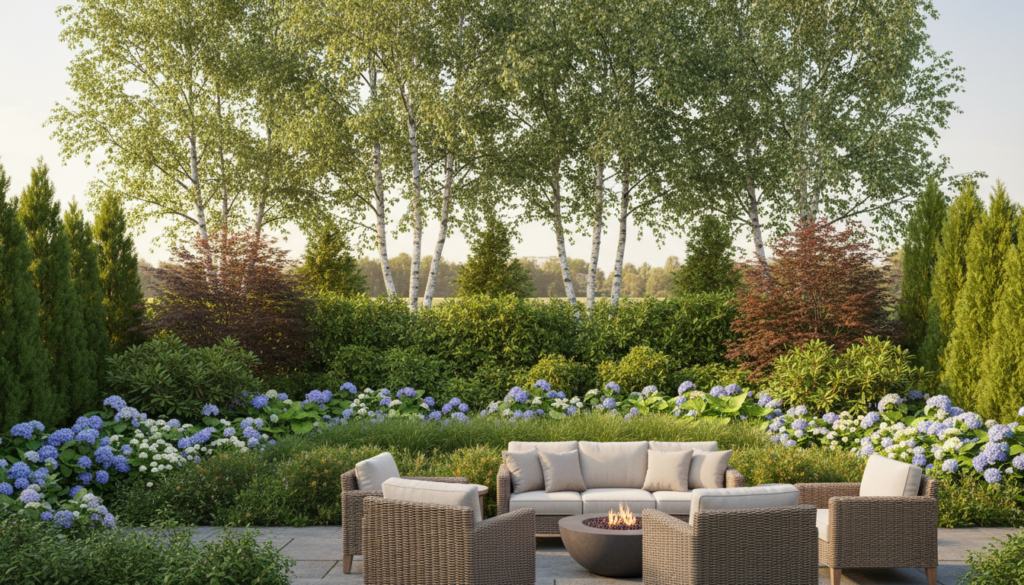 For the ultimate natural privacy, employ a strategy of layering different heights of shrubs and small trees. This creates a dense, multi-dimensional barrier that is both beautiful and highly effective. The mood is lush and deeply natural, reminiscent of a mature woodland edge.