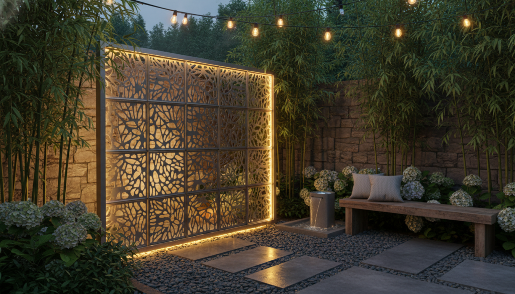 Integrate LED lighting into your privacy screens—backlighting metal panels, highlighting the texture of a gabion wall, or illuminating a living wall. This creates dramatic effects at night, enhancing both privacy and ambiance. The mood is magical and sophisticated, transforming the backyard after dark.