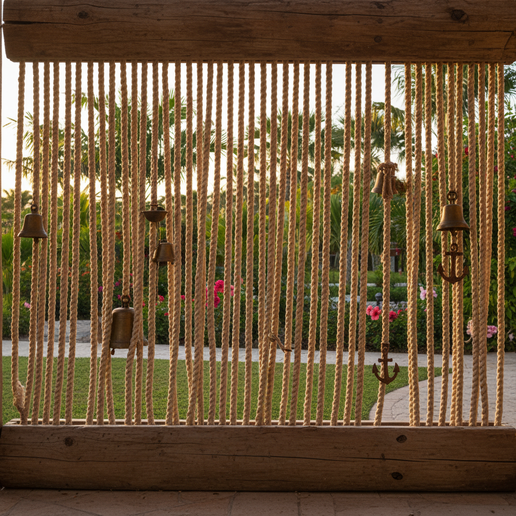 Thick nautical ropes, strung vertically or horizontally between posts, create a unique and textural privacy screen. This idea offers a coastal or industrial-chic aesthetic. The mood is relaxed yet sophisticated, with the natural fibers adding warmth and tactile interest.