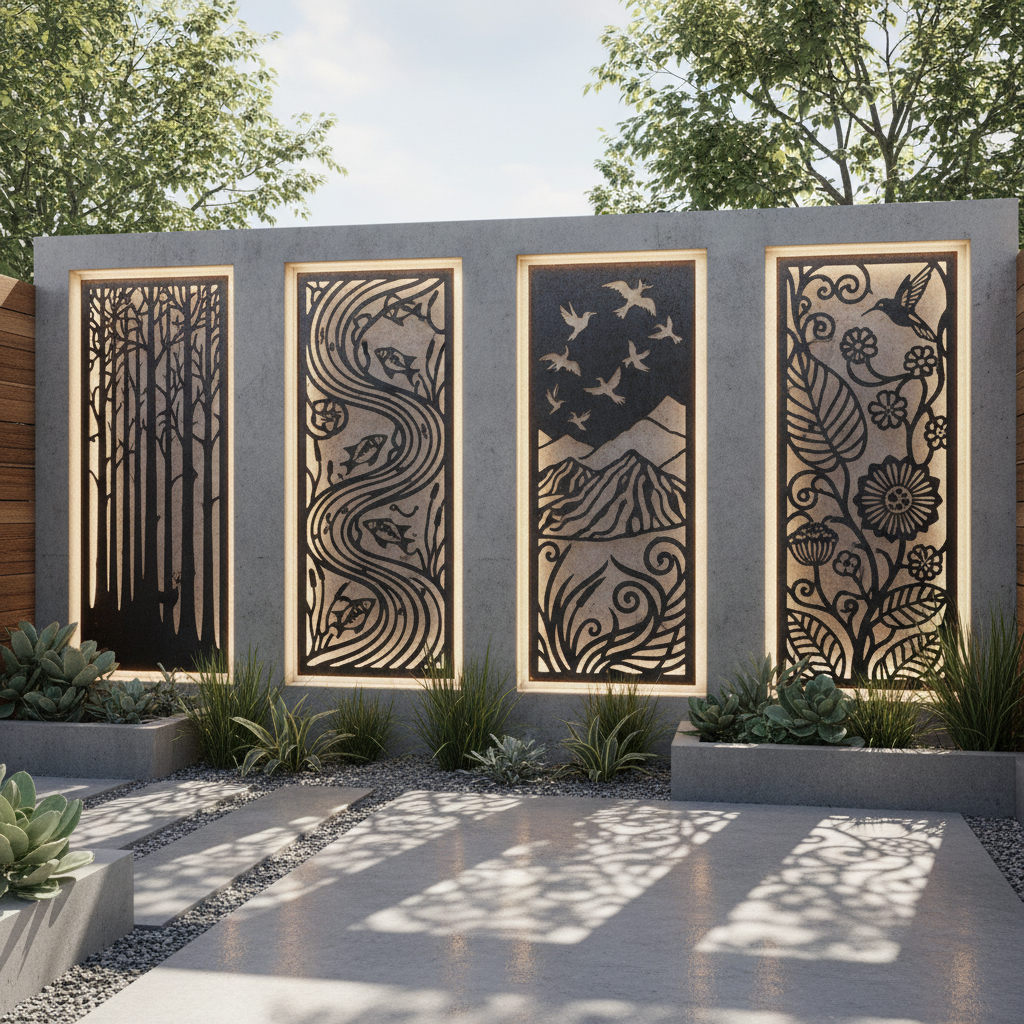 Commission custom art panels made from metal, wood, or weather-resistant composite materials. These can feature abstract designs, nature motifs, or personalized imagery, acting as both privacy screens and sculptural art. The mood is exclusive and highly personal, reflecting individual taste.